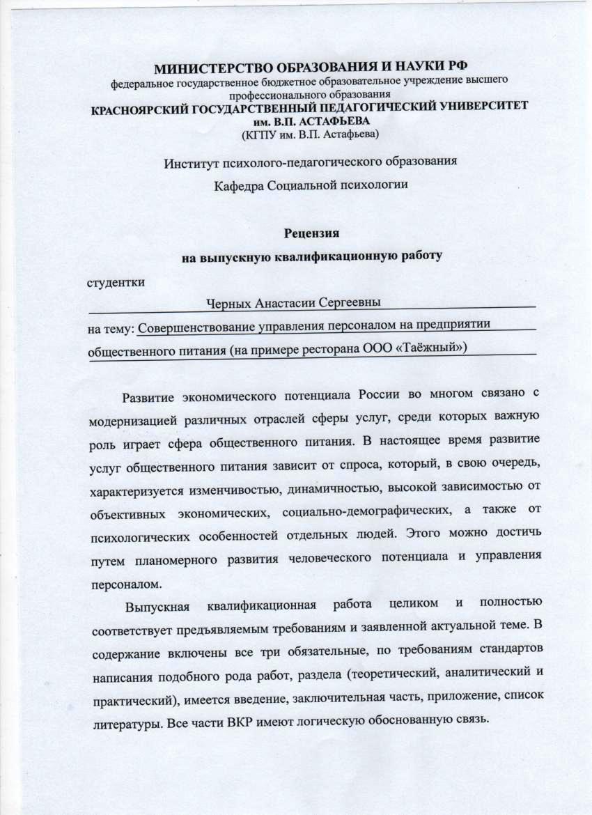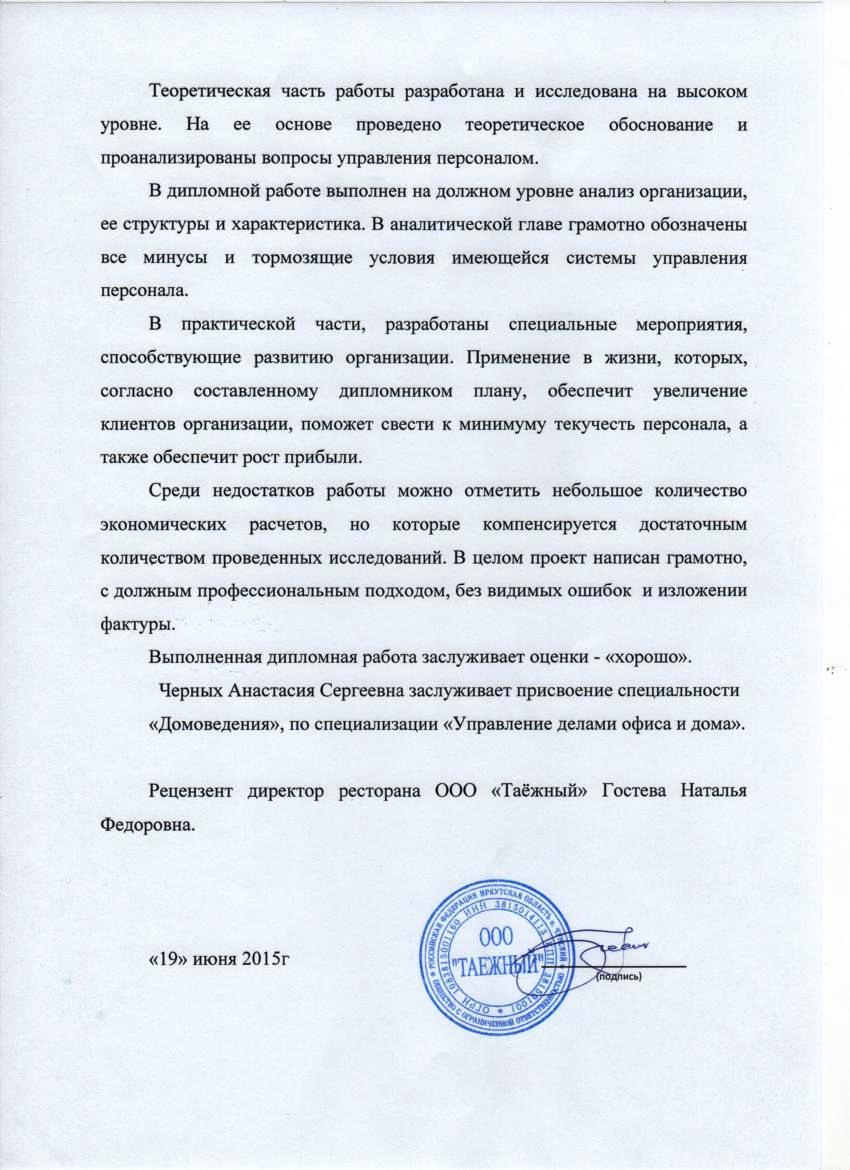 Черных Анастасия Сергеевна "Совершенствование управления персоналом на предприятии общественного питания (на примере ресторана ООО "Таёжный")"