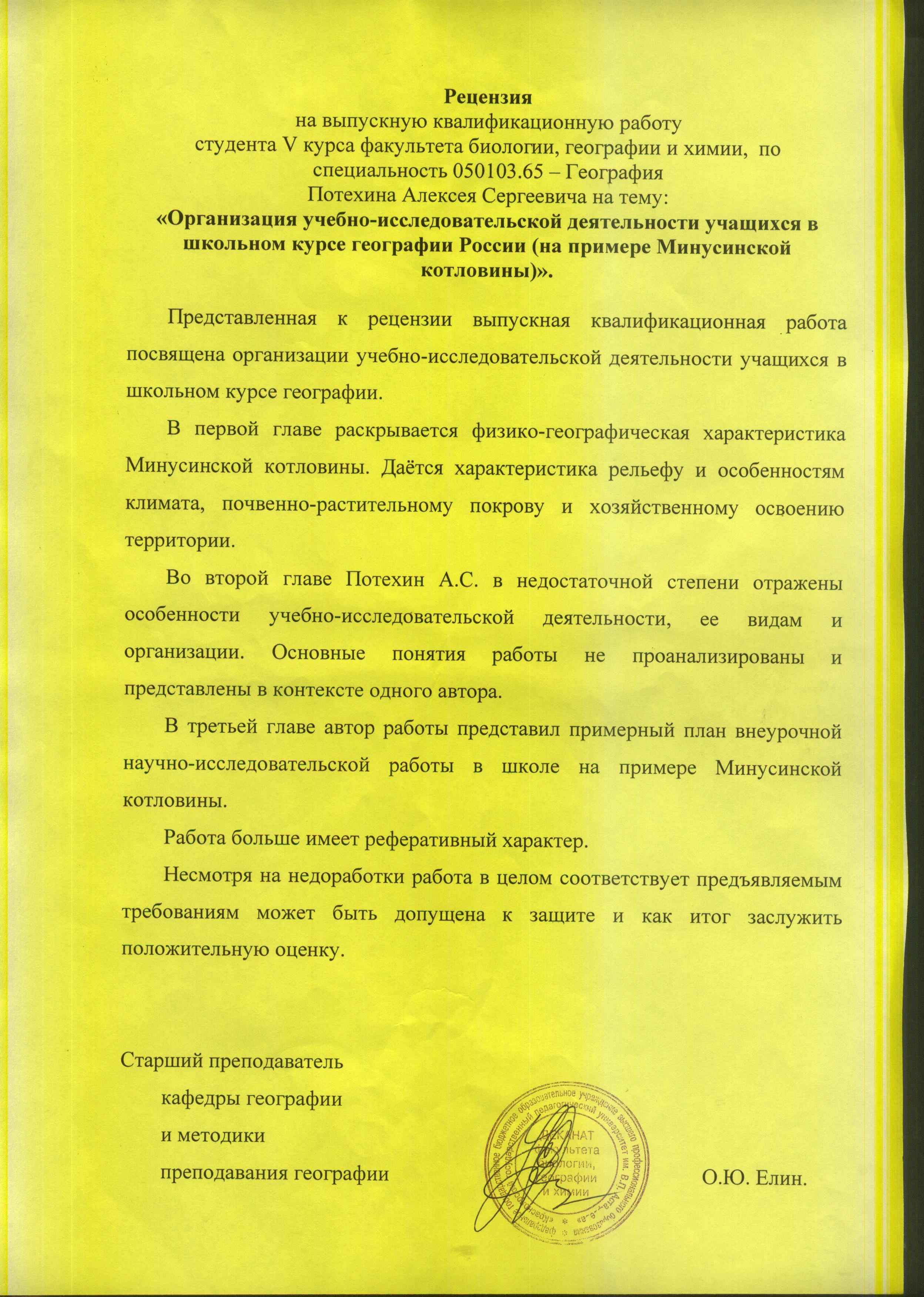 Организация учебно-исследовательской деятельности учащихся в школьном курсе физической географии России (на примере МИнусинской котловины)
