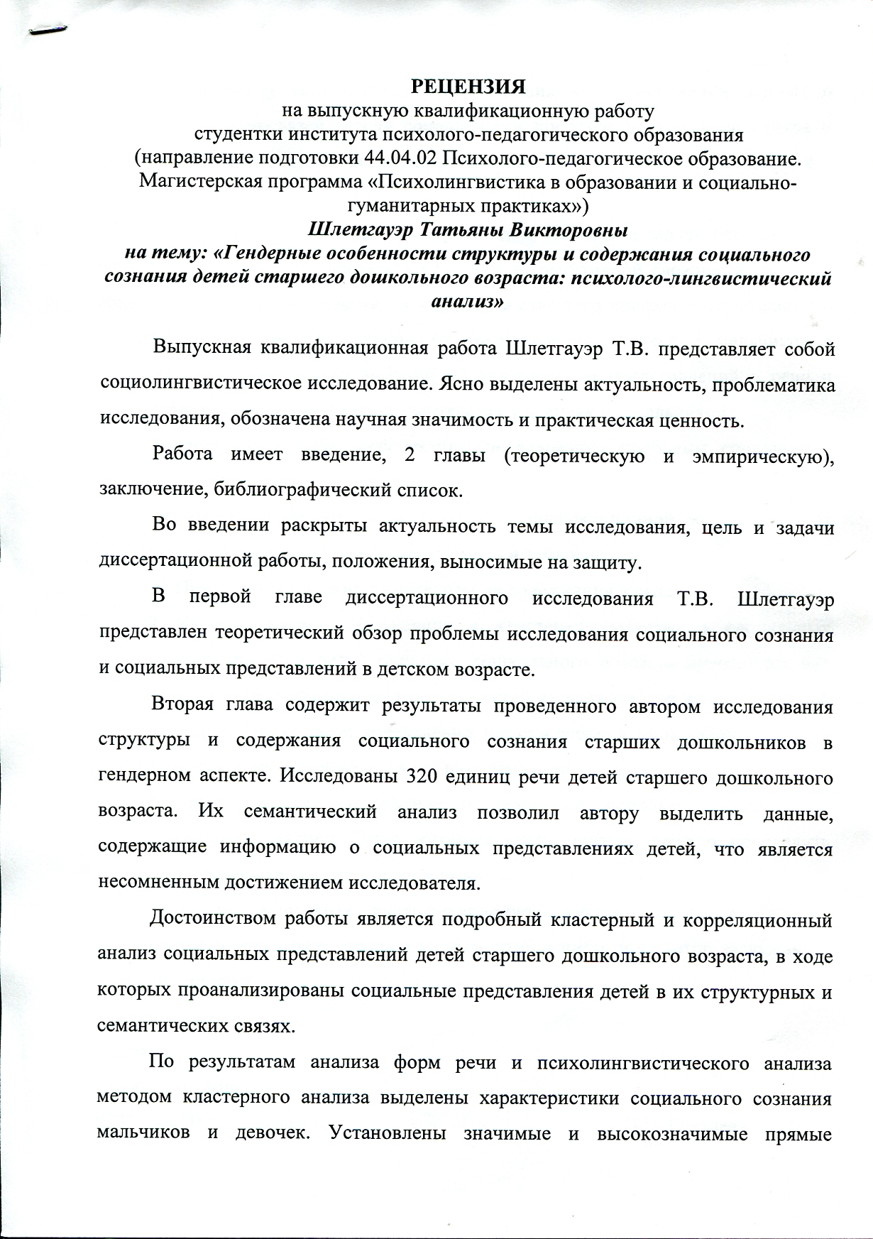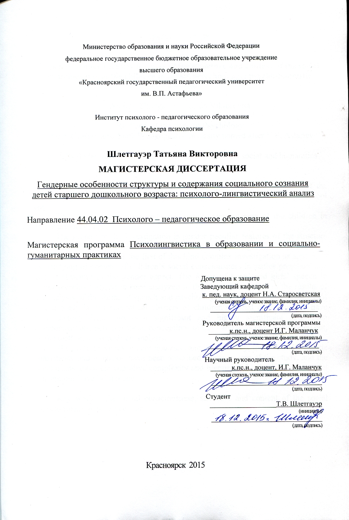 Гендерные особенности структуры и содержания социального сознания lдетей старшего дошкольного возраста: психолингвистический анализ: Магистерская диссертация. Программа Психолингвистика в образовании и социально-гуманитарных практиках
