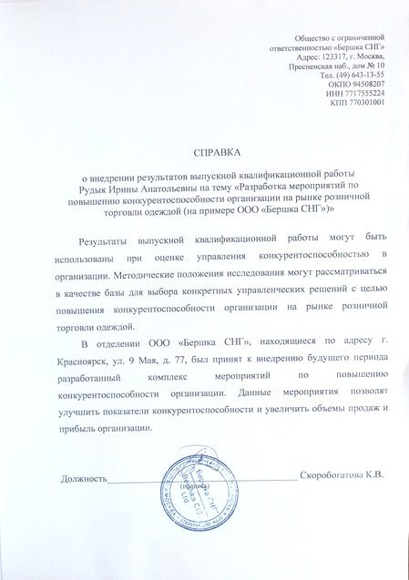 РАЗРАБОТКА МЕРОПРИЯТИЙ ПО ПОВЫШЕНИЮ КОНКУРЕНТОСПОСОБНОСТИ ОРГАНИЗАЦИИ НА РЫНКЕ РОЗНИЧНОЙ ТОРГОВЛИ ОДЕЖДОЙ (НА ПРИМЕРЕ ООО «БЕРШКА СНГ»)