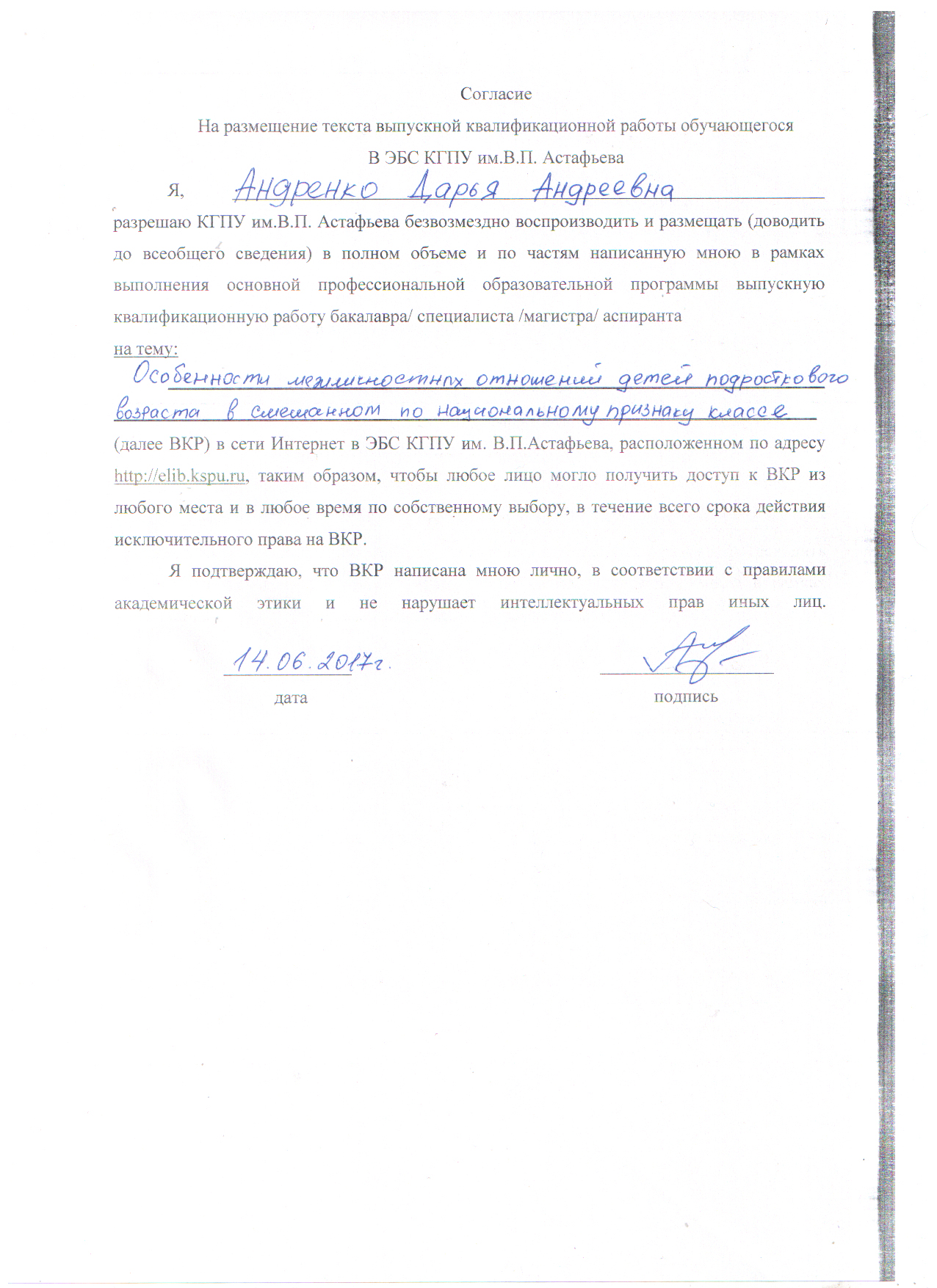 Андренко Д.А. Особенности межличностных отношений подростков в смешанном по национальному признаку классе
