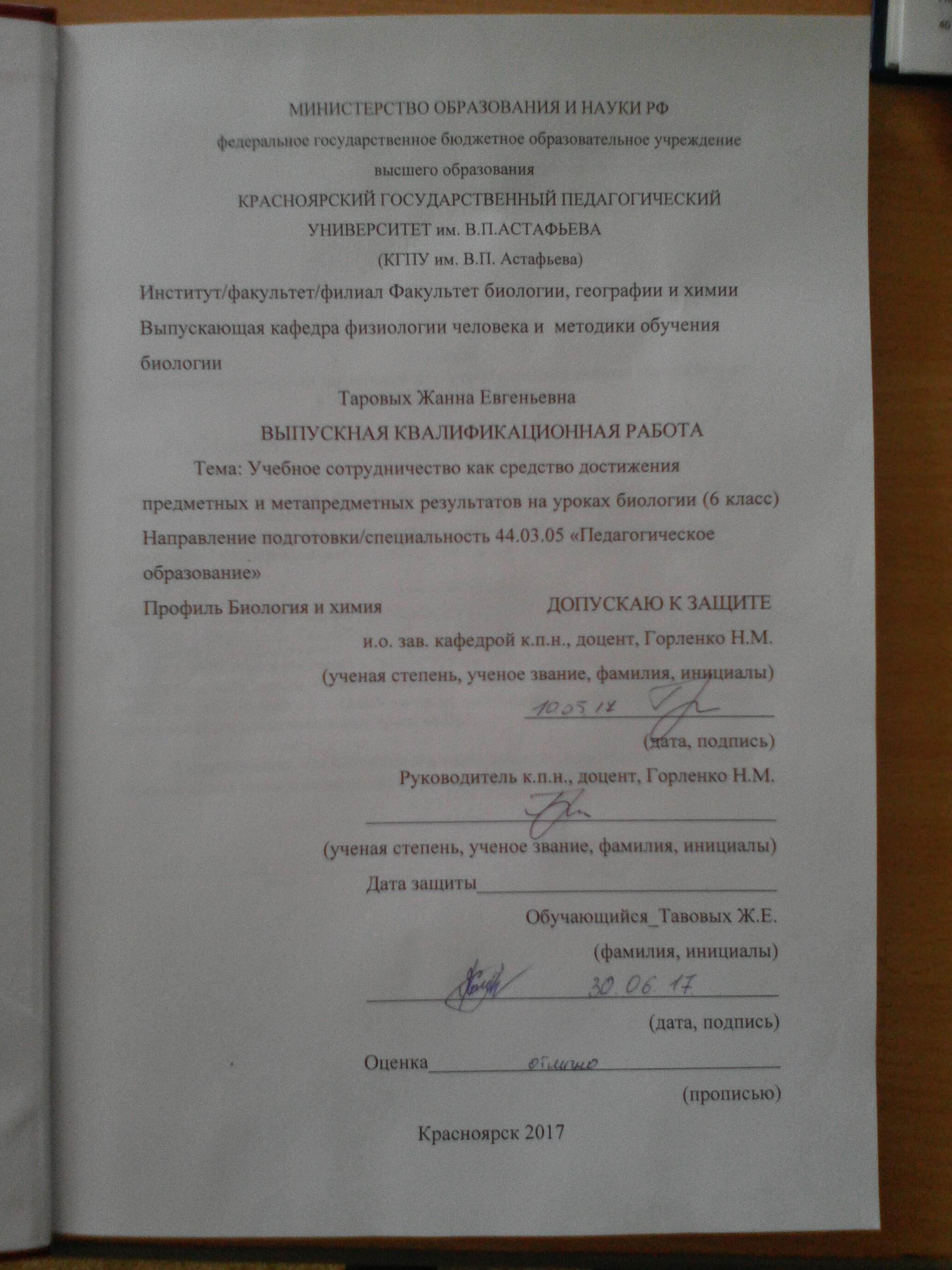 Выпускная квалификационная работа "Учебное сотрудничество как средство достижения предметных и метапредметных результатов на уроках биологии (6 класс)"