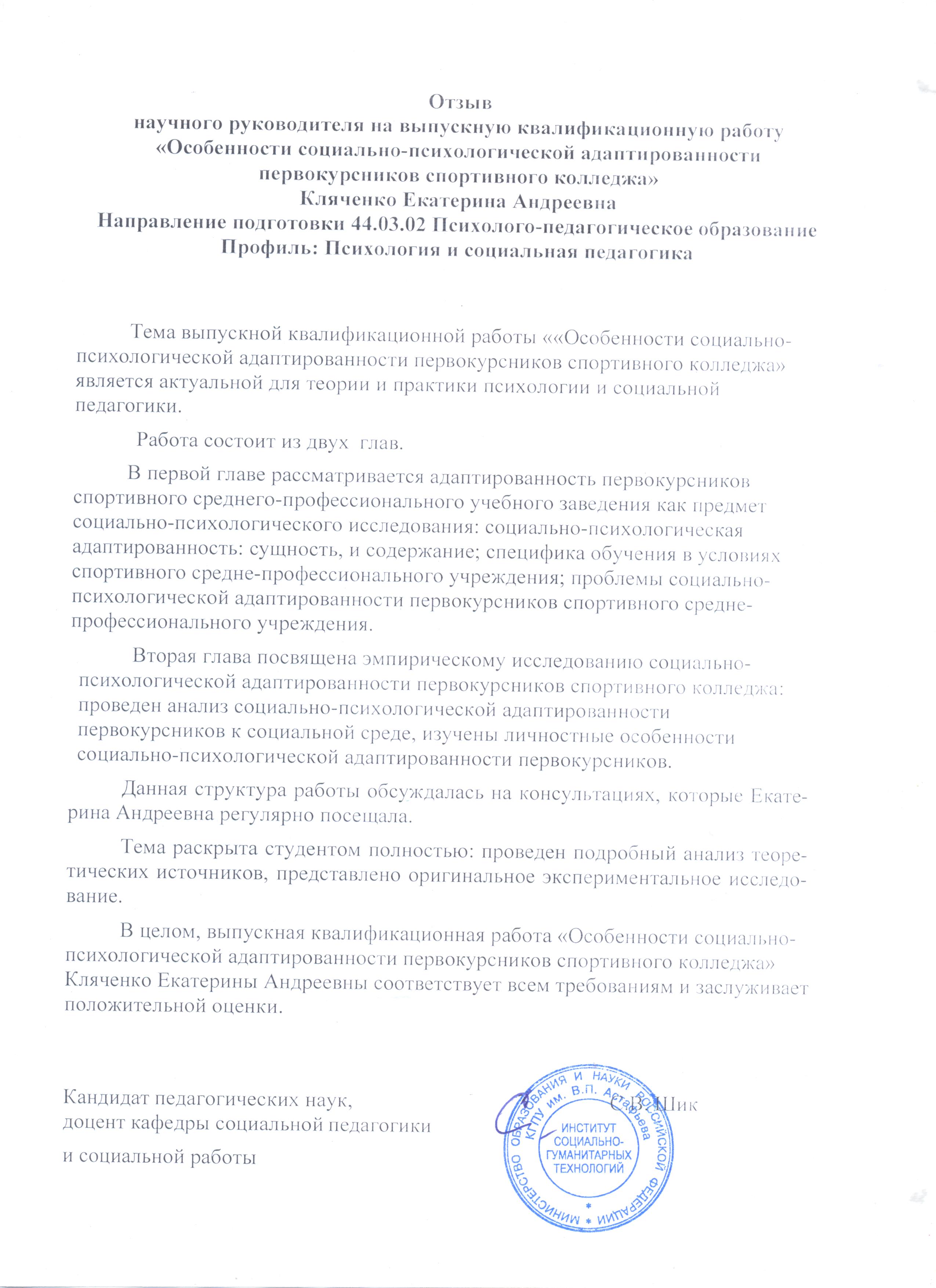 Особенности социально-психологической адаптированности первокурсников спортивного колледжа