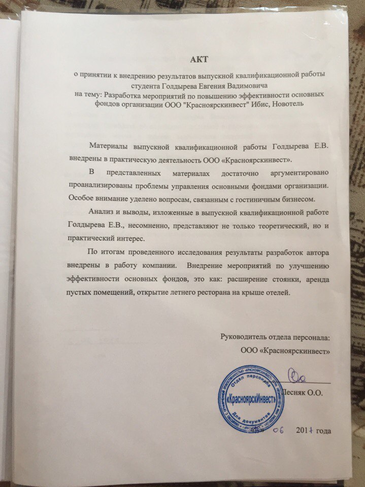 Разработка мероприятий по повышению эффективности основных фондов (общество с ограниченной ответственностью "КРАСНОЯРСКИНВЕСТ" Ибис, Новотель