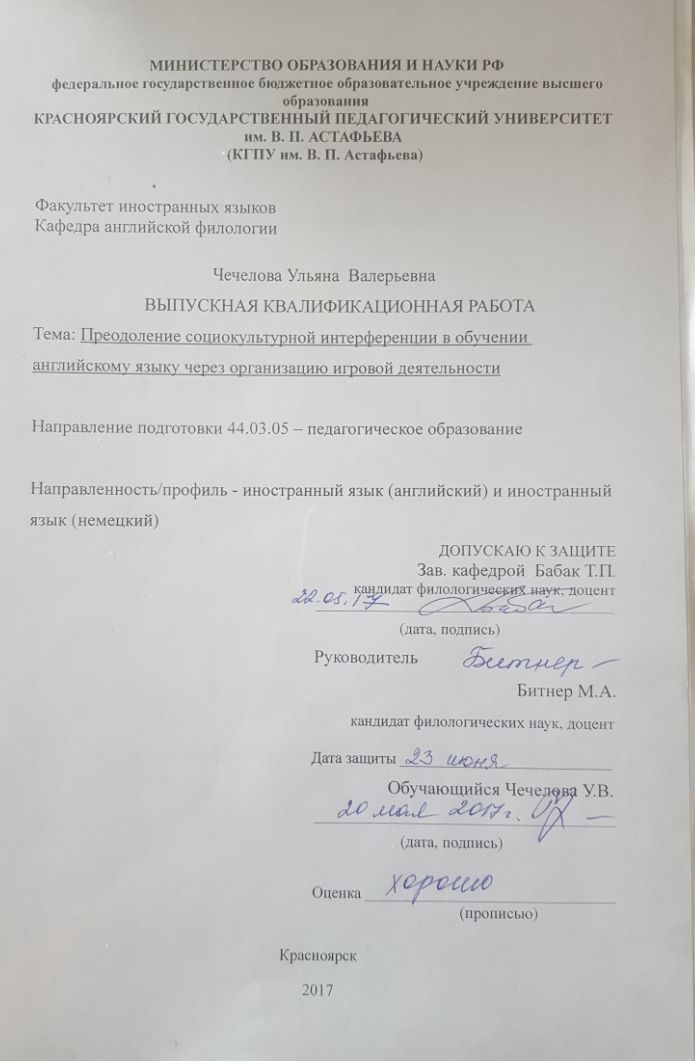 Чечелова У.В. Преодоление социокультурной интерференции в обучении английскому языку через организацию игровой деятельности