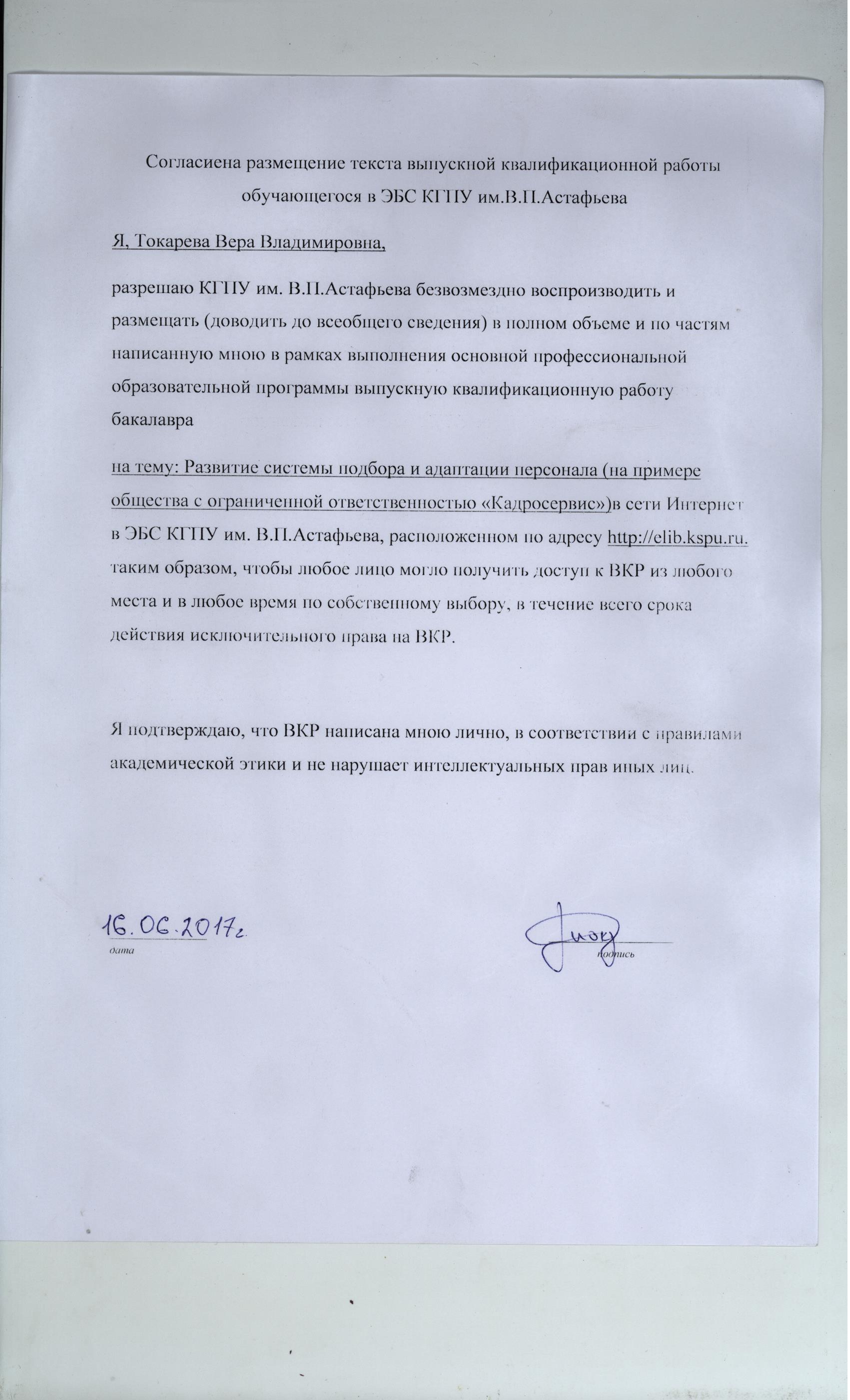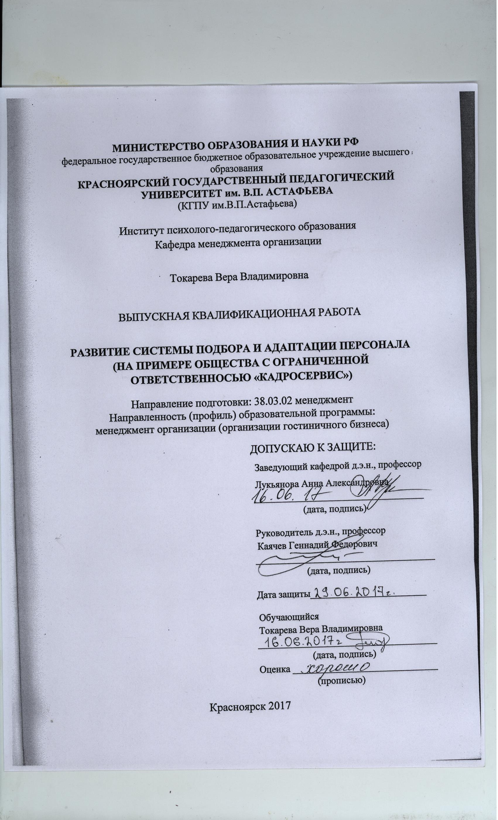 РАЗВИТИЕ СИСТЕМЫ ПОДБОРА И АДАПТАЦИИ ПЕРСОНАЛА (НА ПРИМЕРЕ ОБЩЕСТВА С ОГРАНИЧЕННОЙ ОТВЕТСТВЕННОСЬЮ «КАДРОСЕРВИС»)