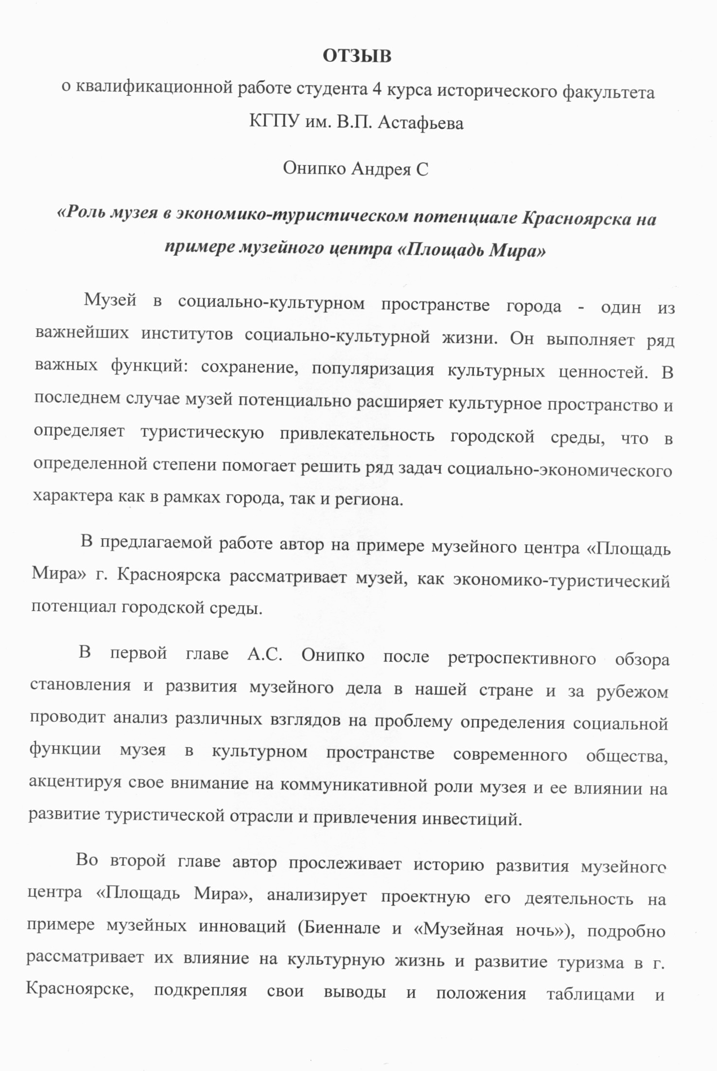 Роль музея в экономико-туристическом потенциале Красноярска на примере музейного центра «Площадь Мира»
