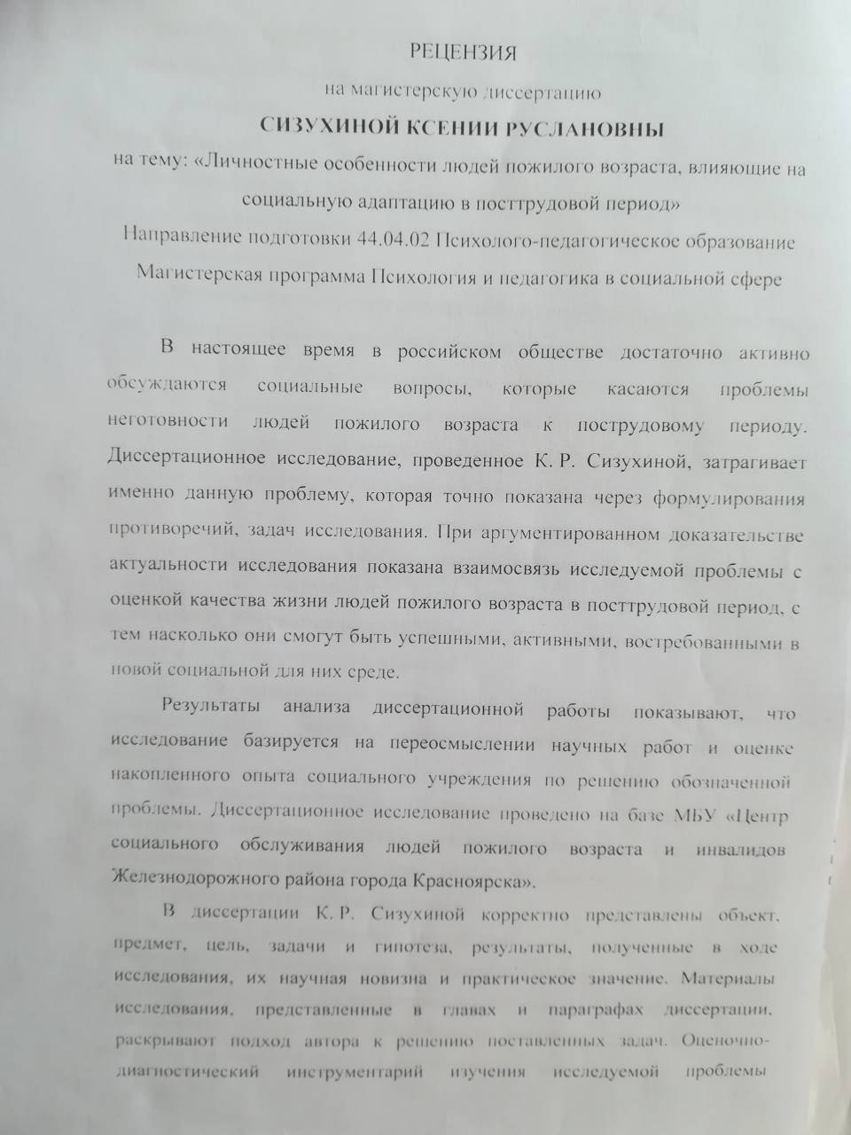 Личностные особенности людей пожилого возраста, влияющие на социальную адаптацию в посттрудовой период