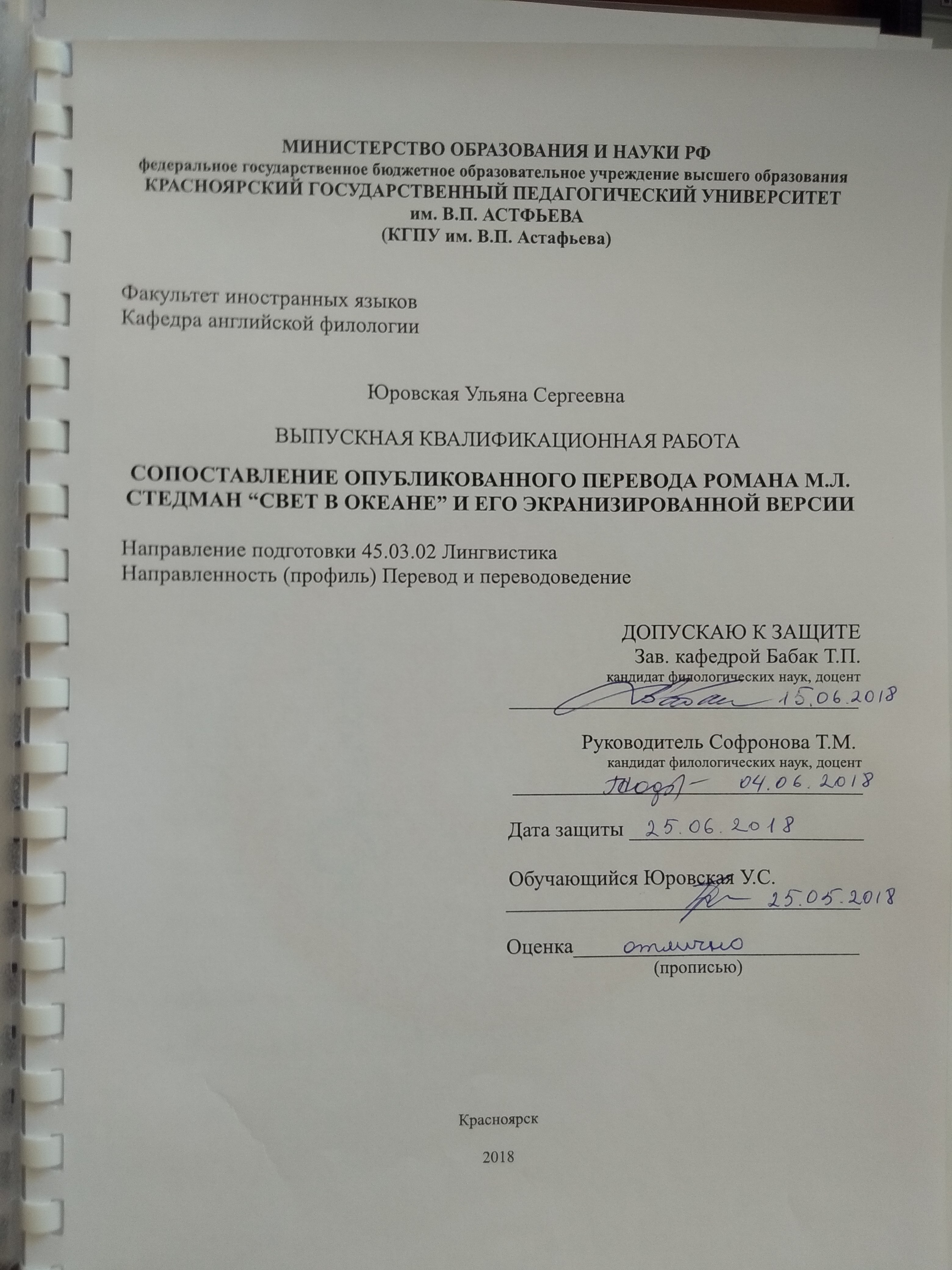 СОПОСТАВЛЕНИЕ ОПУБЛИКОВАННОГО ПЕРЕВОДА РОМАНА М.Л. СТЕДМАН “СВЕТ В ОКЕАНЕ” И ЕГО ЭКРАНИЗИРОВАННОЙ ВЕРСИИ
