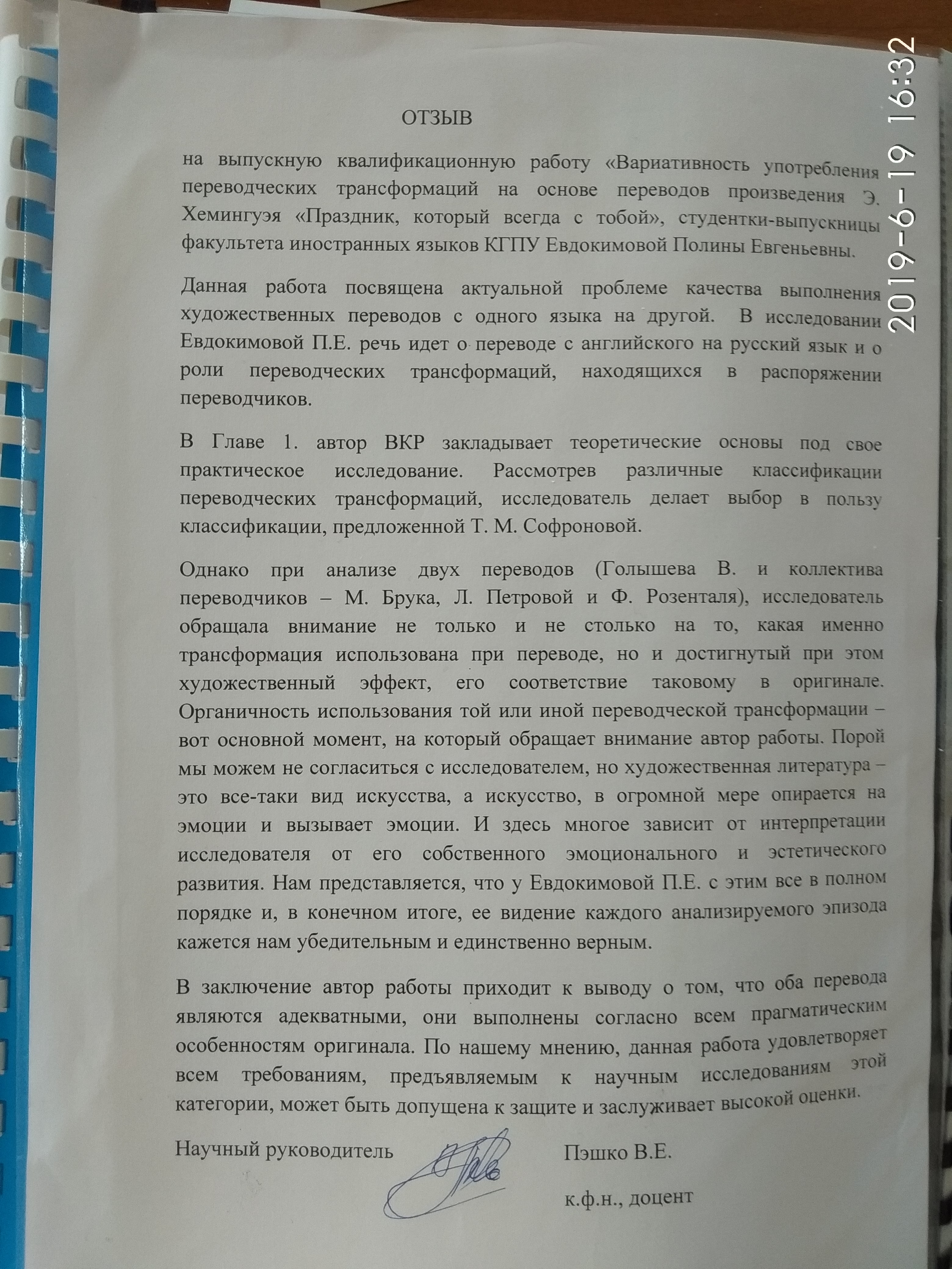 Вариативность употребления переводческих трансформаций на основе переводов произведения Эрнеста Миллера Хемингуэя «Праздник, который всегда с тобой»