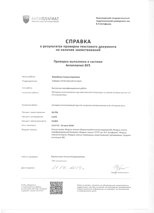 МЕТОДИКА ИСПОЛЬЗОВАНИЯ ХУДОЖЕСТВЕННОЙ ЛИТЕРАТУРЫ НА УРОКАХ ИСТОРИИ РОССИИ В 8-9 КЛАССАХ