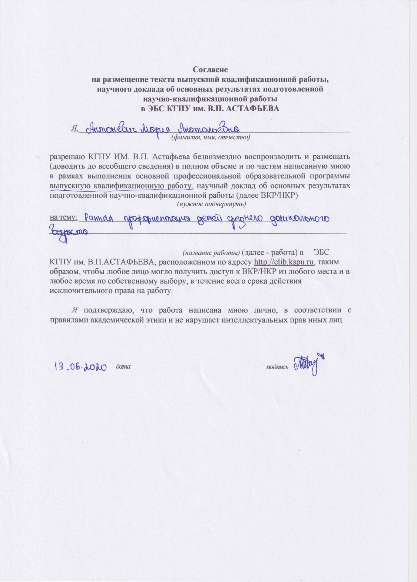 ВКР Антоневич М А Ранняя профориентация детей среднего дошкольного возраста