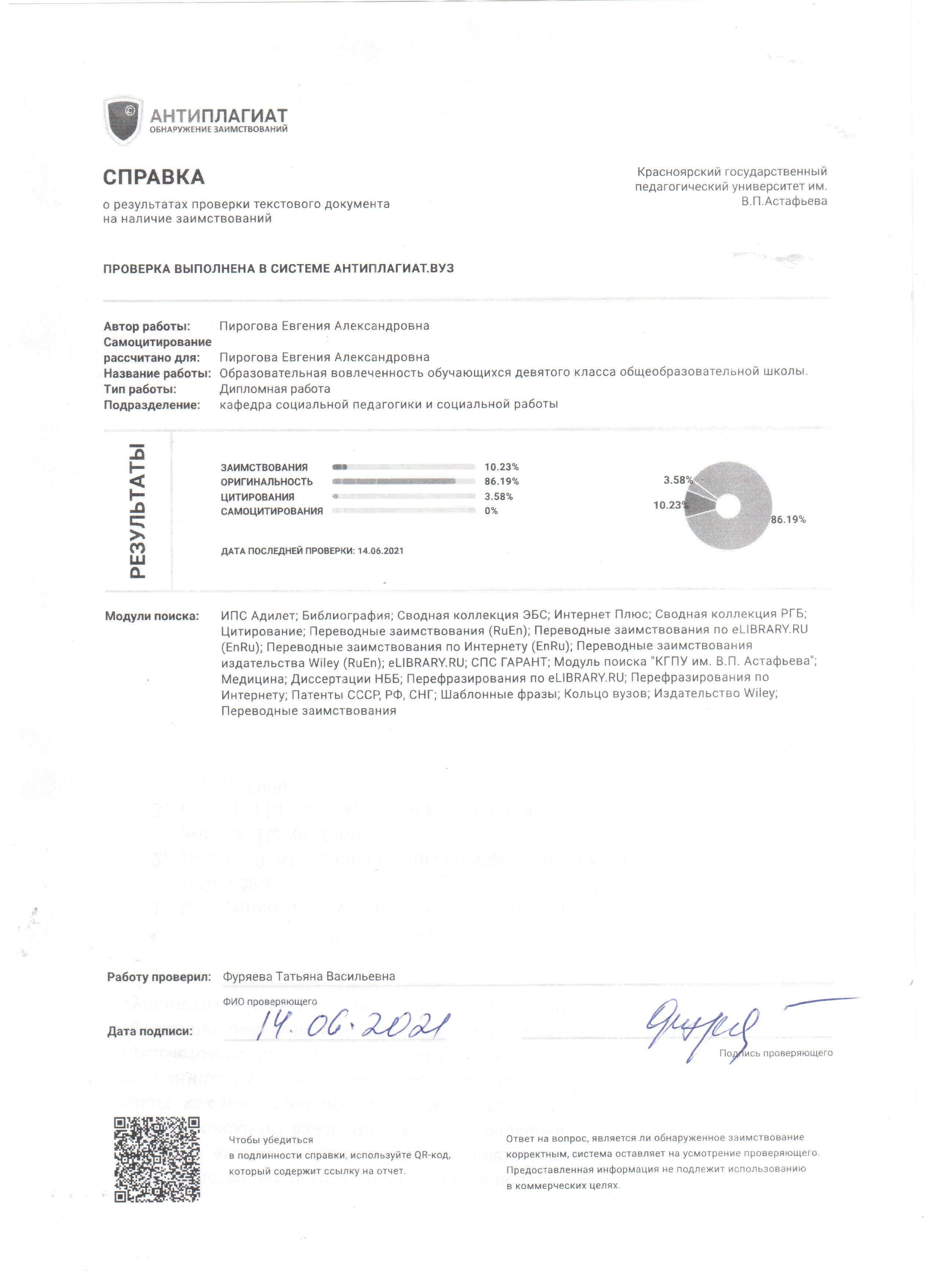 ВЫПУСКНАЯ КВАЛИФИКАЦИОННАЯ РАБОТА Образовательная вовлеченность обучающихся 9 класса общеобразовательной школы.