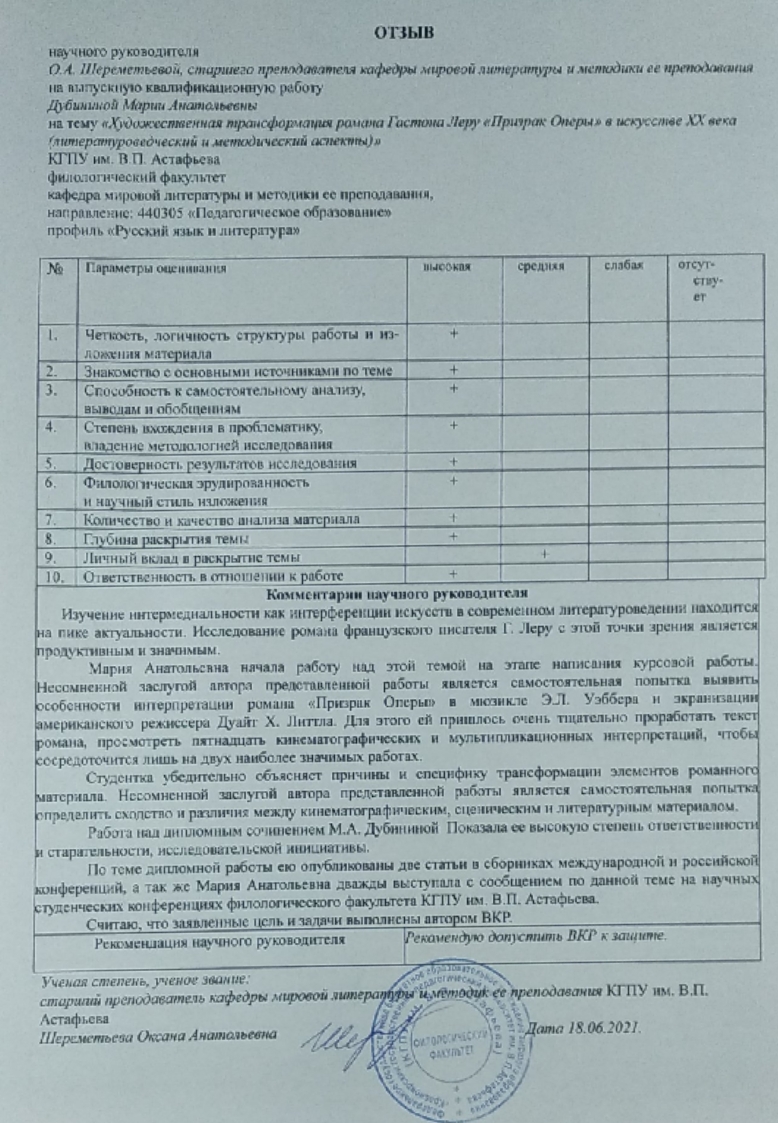 Художественная трансформация романа гастона Леру «Призрак Оперы» в искусстве XX века (литературоведческий и методический аспекты)