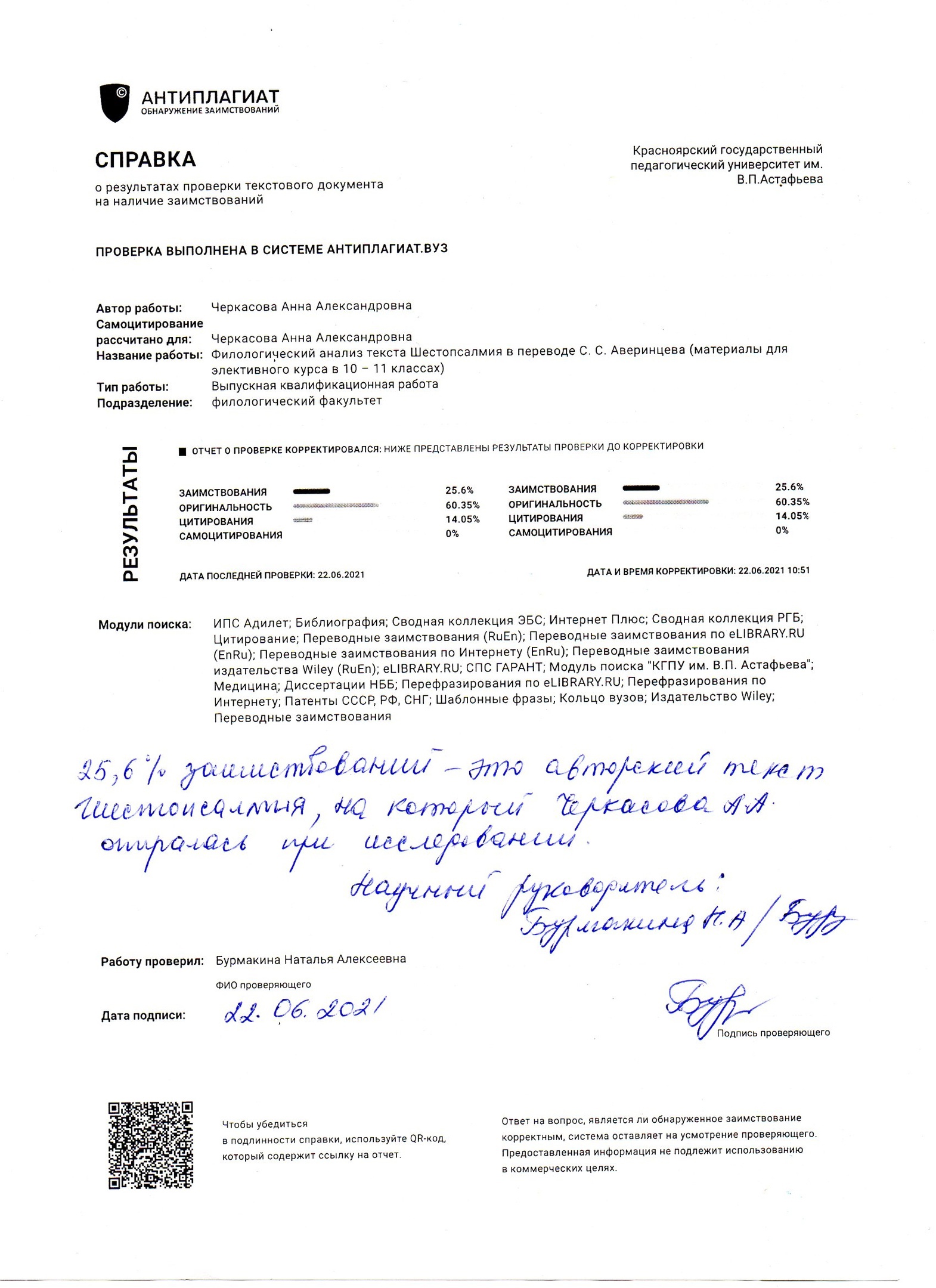 Черкасова А.А. Филологический анализ текста Шестопсалмия в переводе С. С. Аверинцева (материалы для элективного курса в 10 – 11 классах)