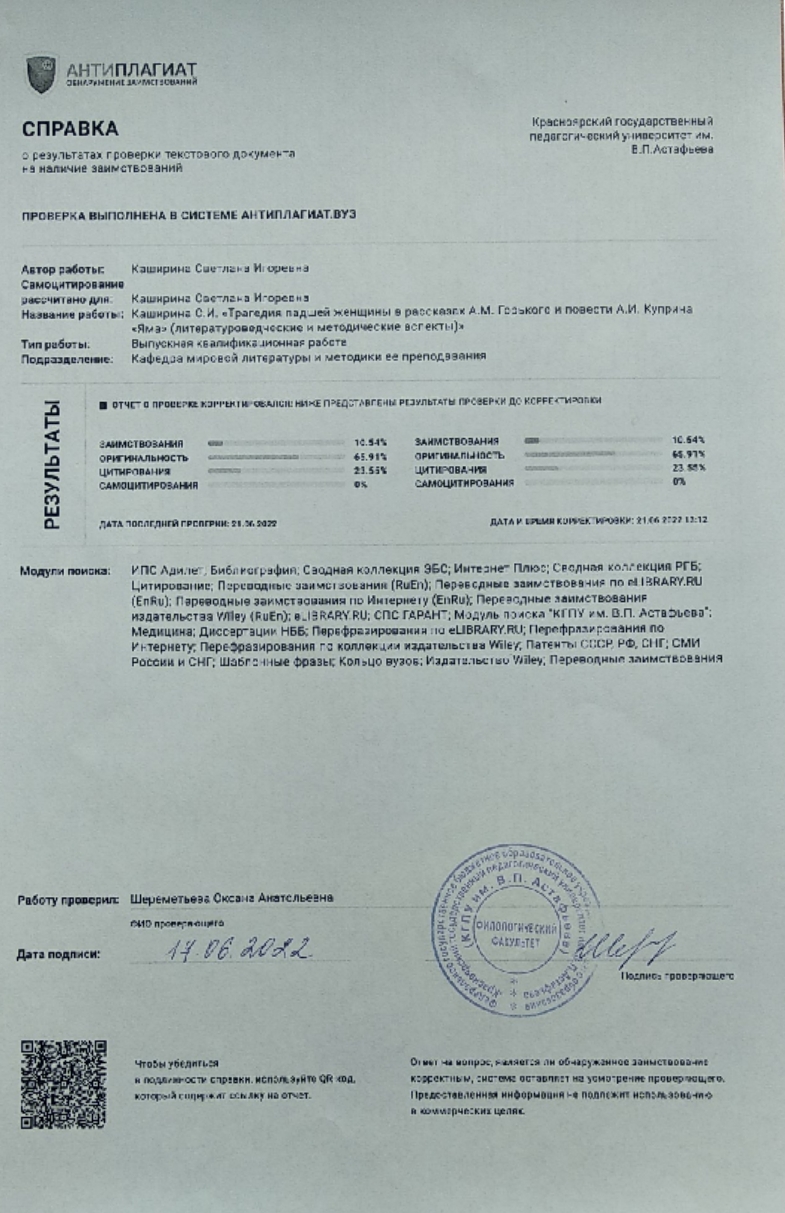 Трагедия падшей женщины в рассказах А.М.Горького и повести А.И.Куприна "Яма" (литературоведческие и методические аспекты)