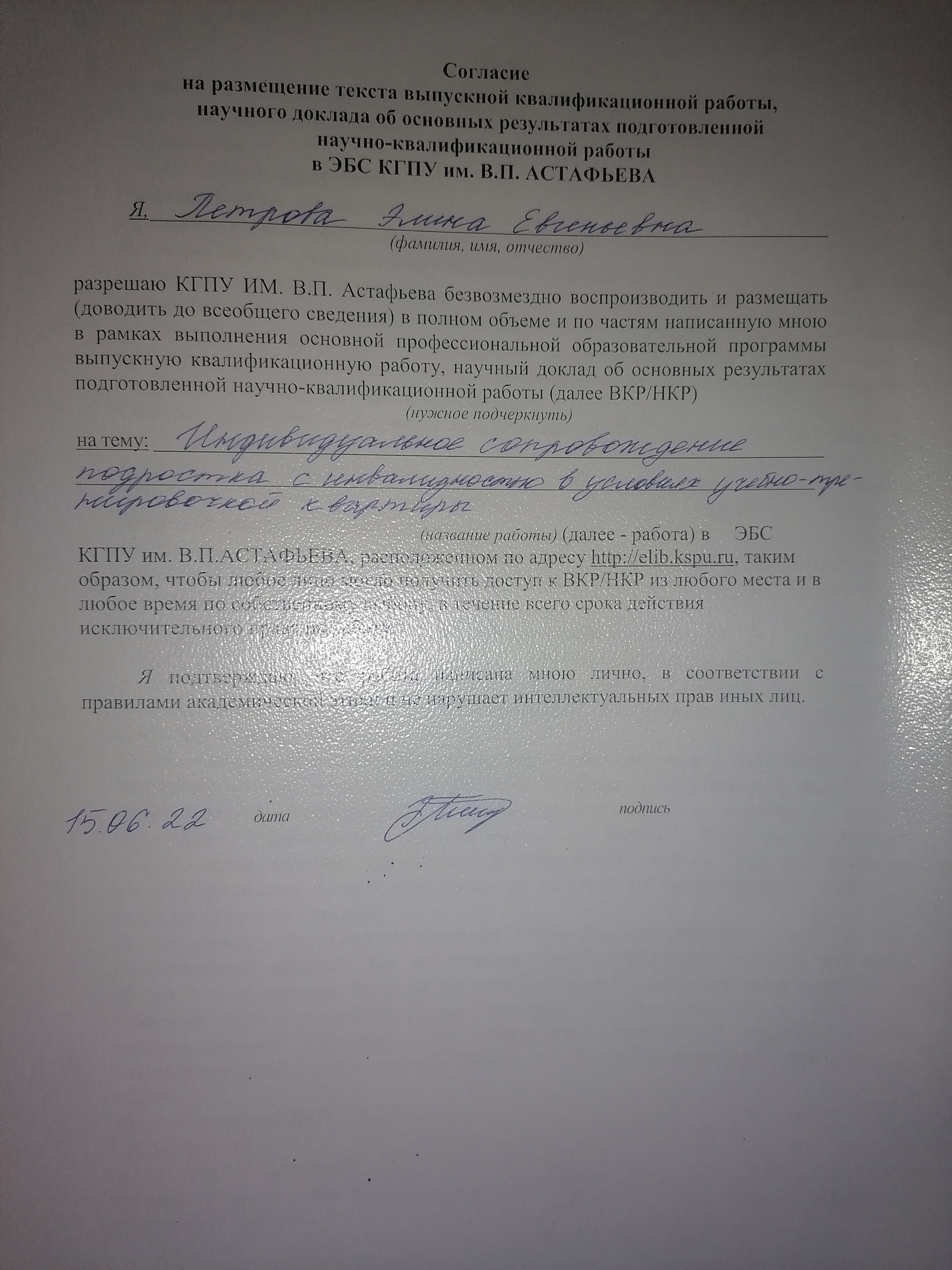 Петрова Элина Евгеньевна Индивидуальное сопровождение подростка с инвалидностью в условиях учбно-тренеровочной квартиры