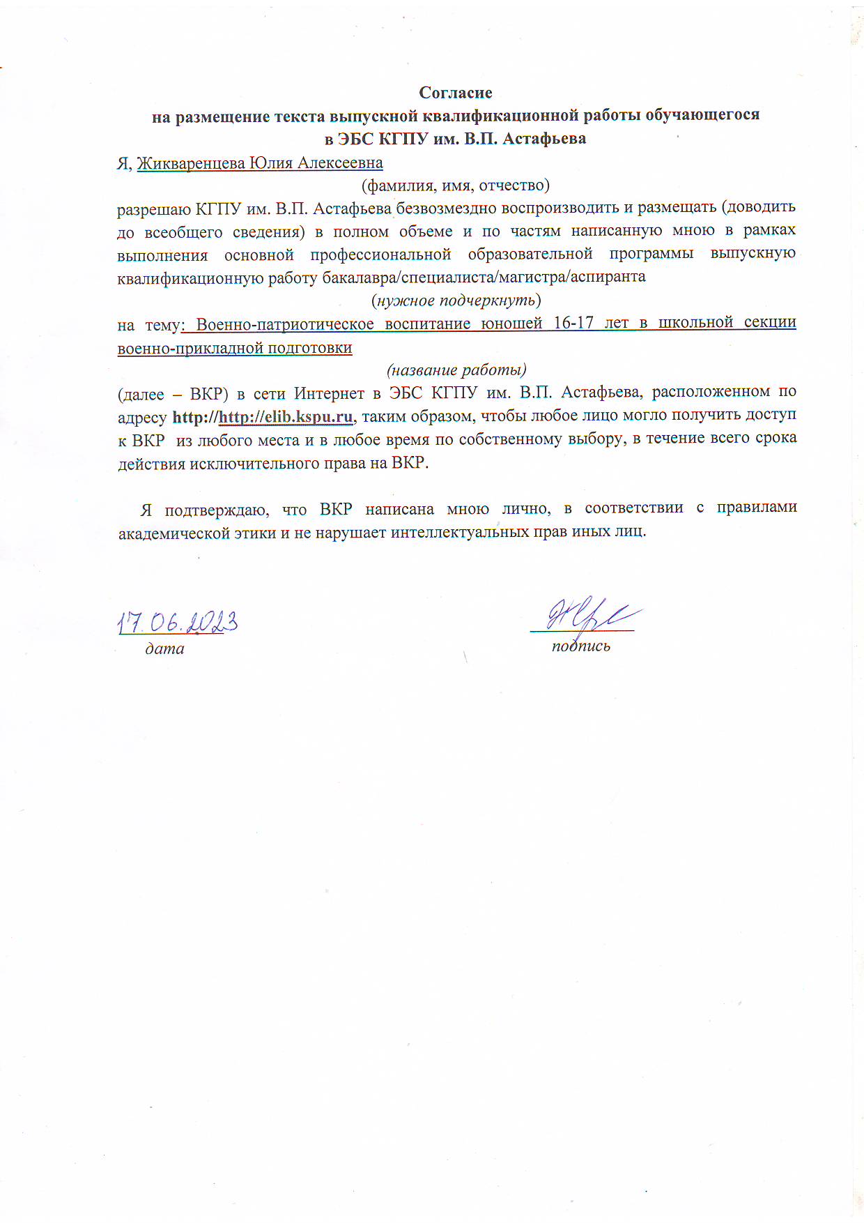Военно-патриотическое воспитание юношей 16-17 лет в школьной секции военно-прикладной подготовки