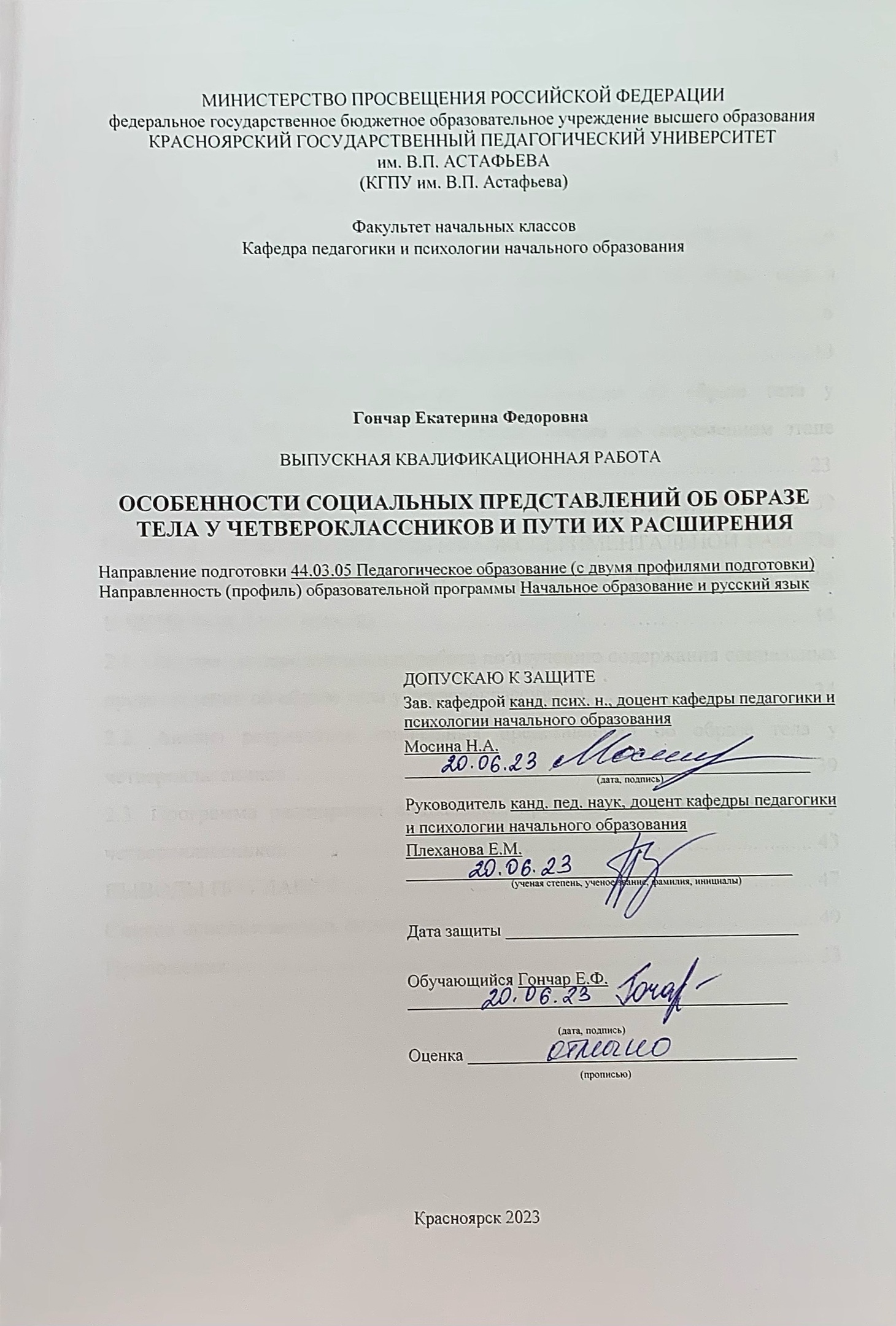 ОСОБЕННОСТИ СОЦИАЛЬНЫХ ПРЕДСТАВЛЕНИЙ ОБ ОБРАЗЕ ТЕЛА У ЧЕТВЕРОКЛАССНИКОВ И ПУТИ ИХ РАСШИРЕНИЯ