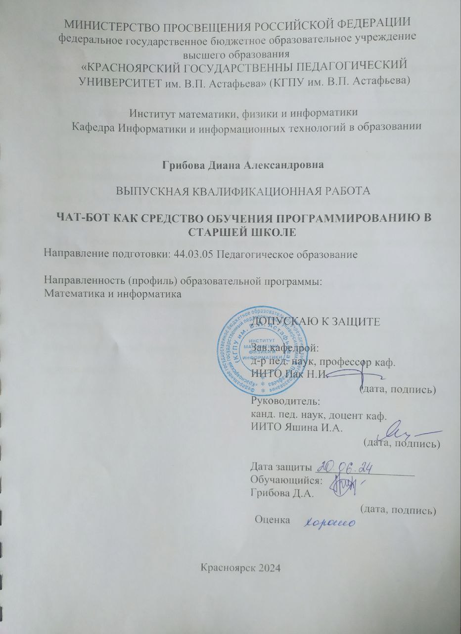 ЧАТ-БОТ КАК СРЕДСТВО ОБУЧЕНИЯ ПРОГРАММИРОВАНИЮ В СТАРШЕЙ ШКОЛЕ
