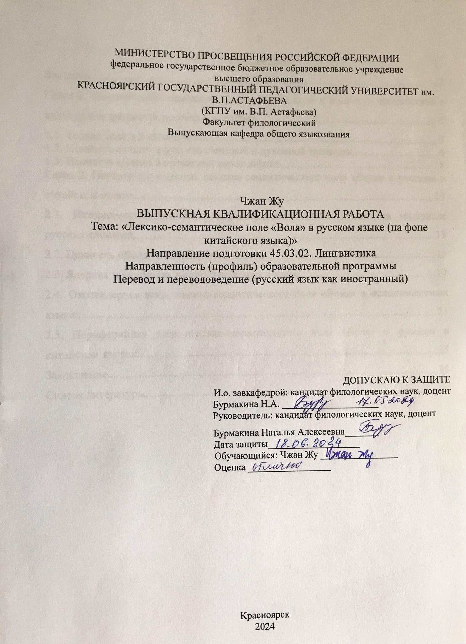 Лексико-семантическое поле «Воля» в русском языке (на фоне китайского языка)