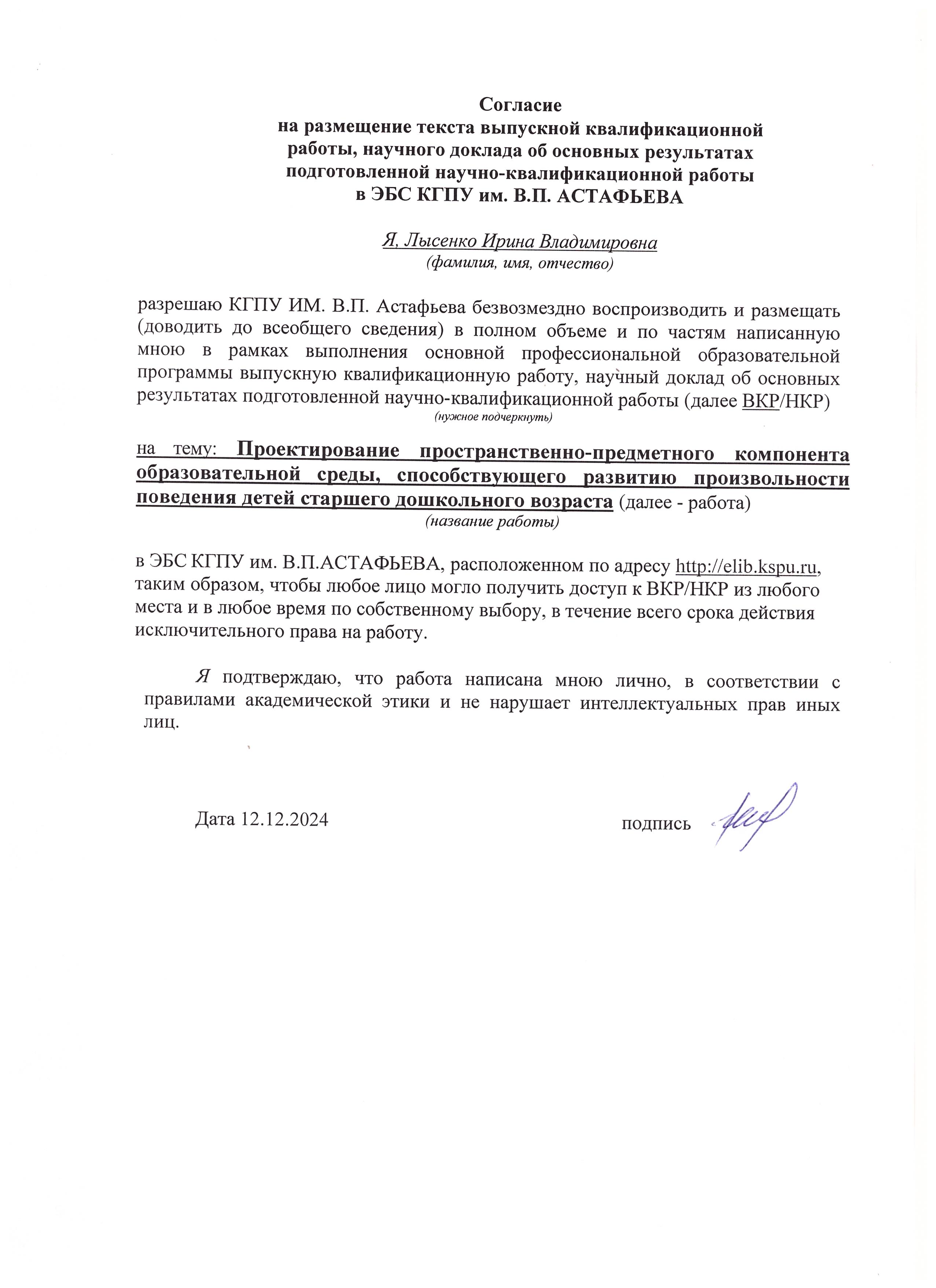 Лысенко Ирина Владимировна Проектирование пространственно-предметного компонента образовательной среды, способствующего развитию произвольности поведения детей старшего дошкольного возраста