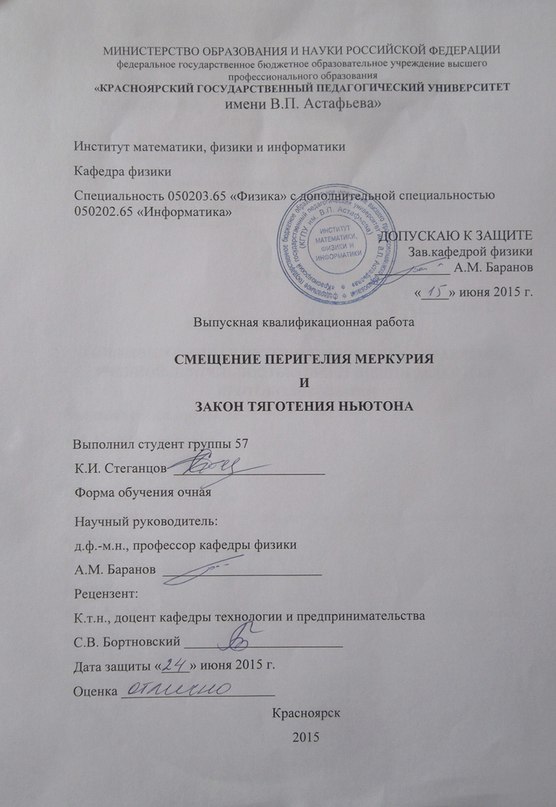 Стеганцов К.И. "Смещение перигелия Меркурия и закон тяготения Ньютона" (научн.рук.:д.ф.м.н., проф.Баранов А.М.; рецензент: к.т.н.,доц.Бортновский)