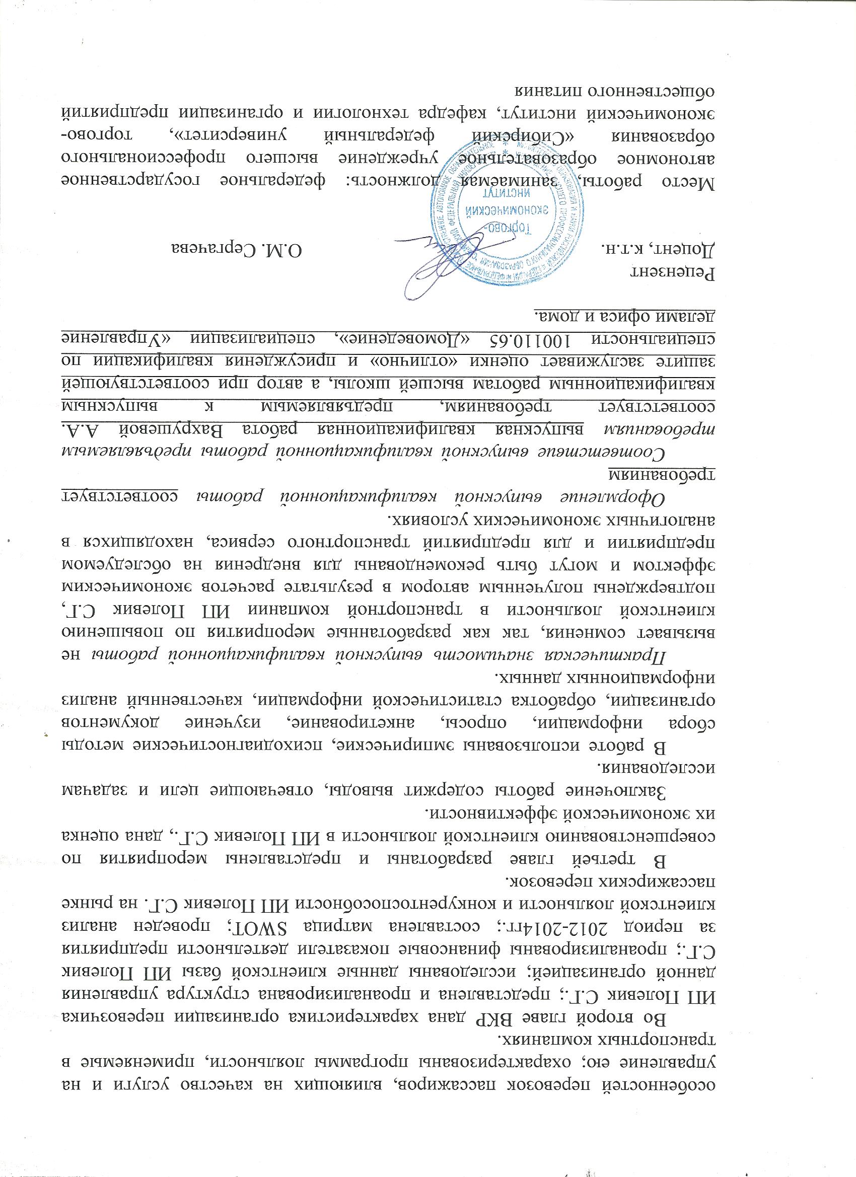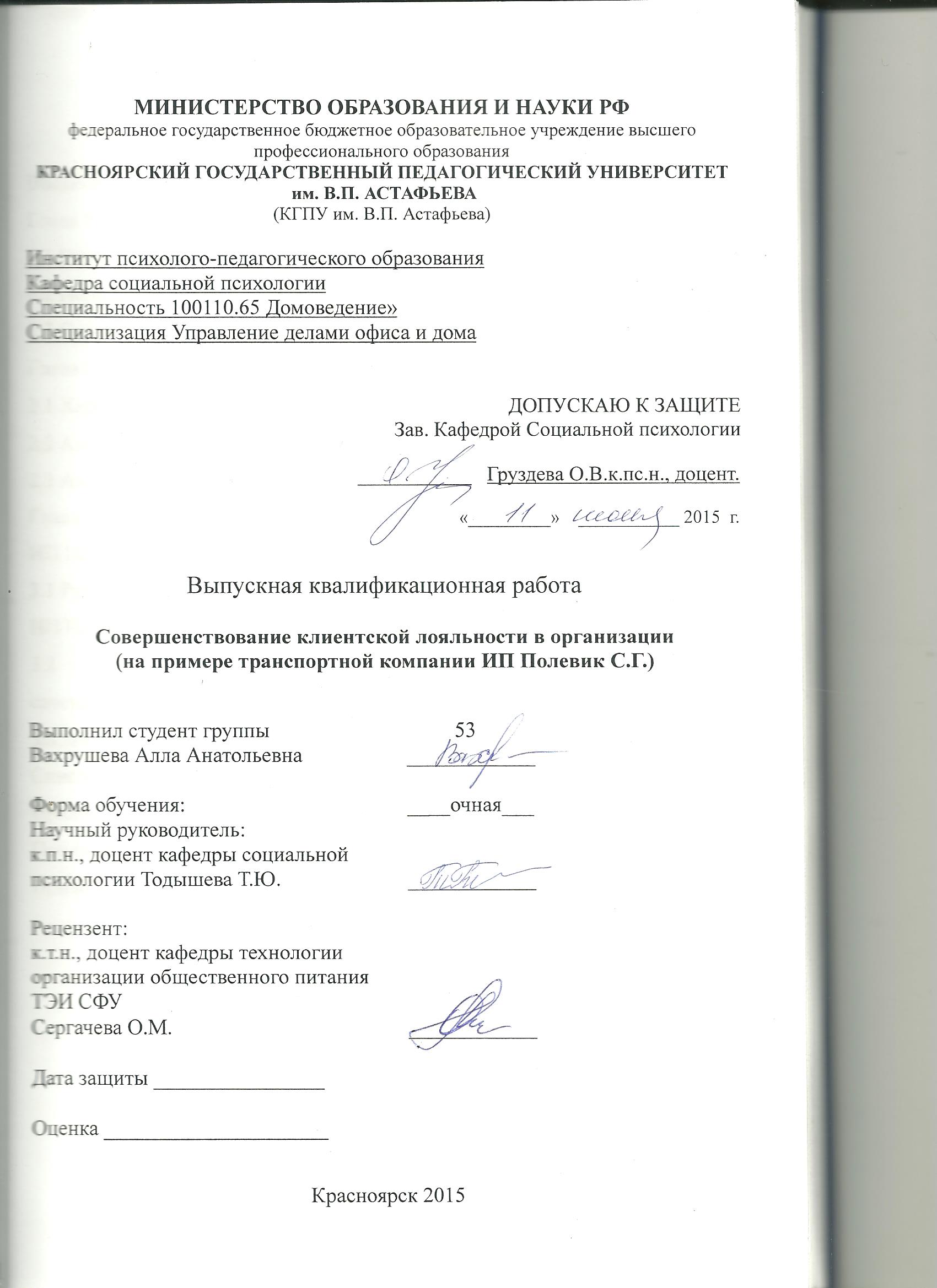 ВКР. Вахрушева А.Ан. "Совершенствование клиентской лояльности в организации (на примере транспортной компании ИП Полевик С.Г.)"