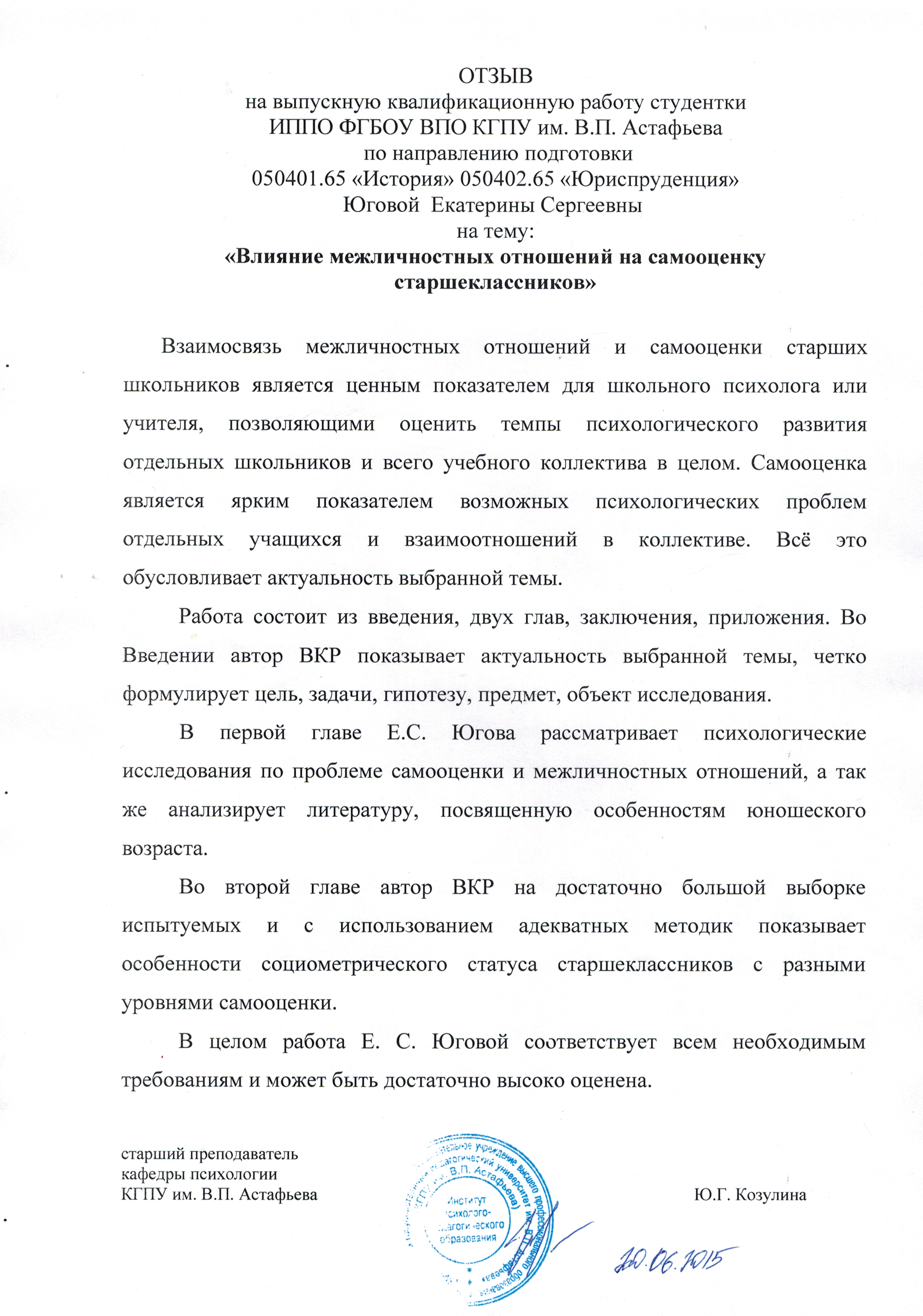 Югова Е.С. Влияние межличностных отношений на самооценку старшеклассников