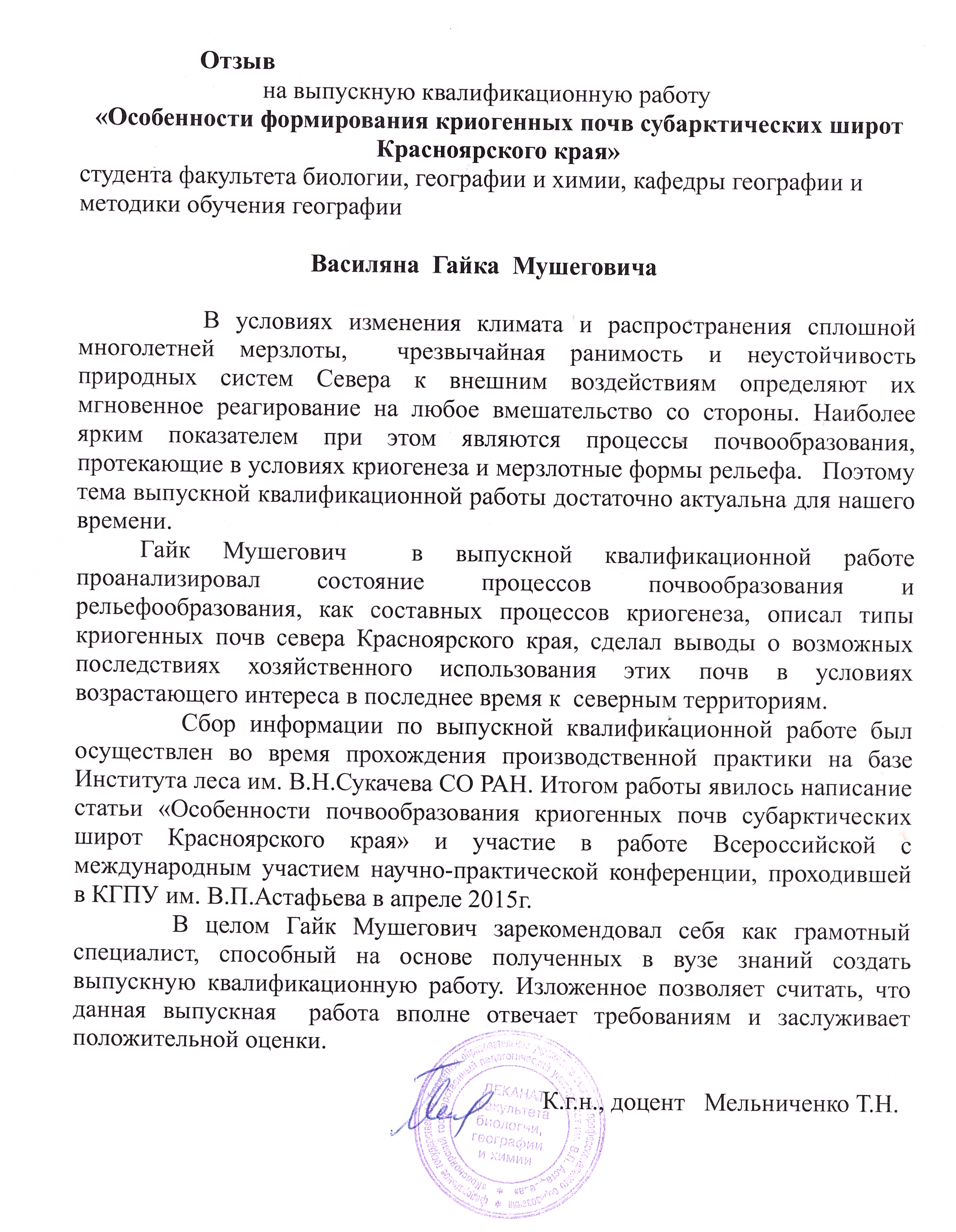 Особенности формирования криогенных почв субарктических широт Красноярского края.