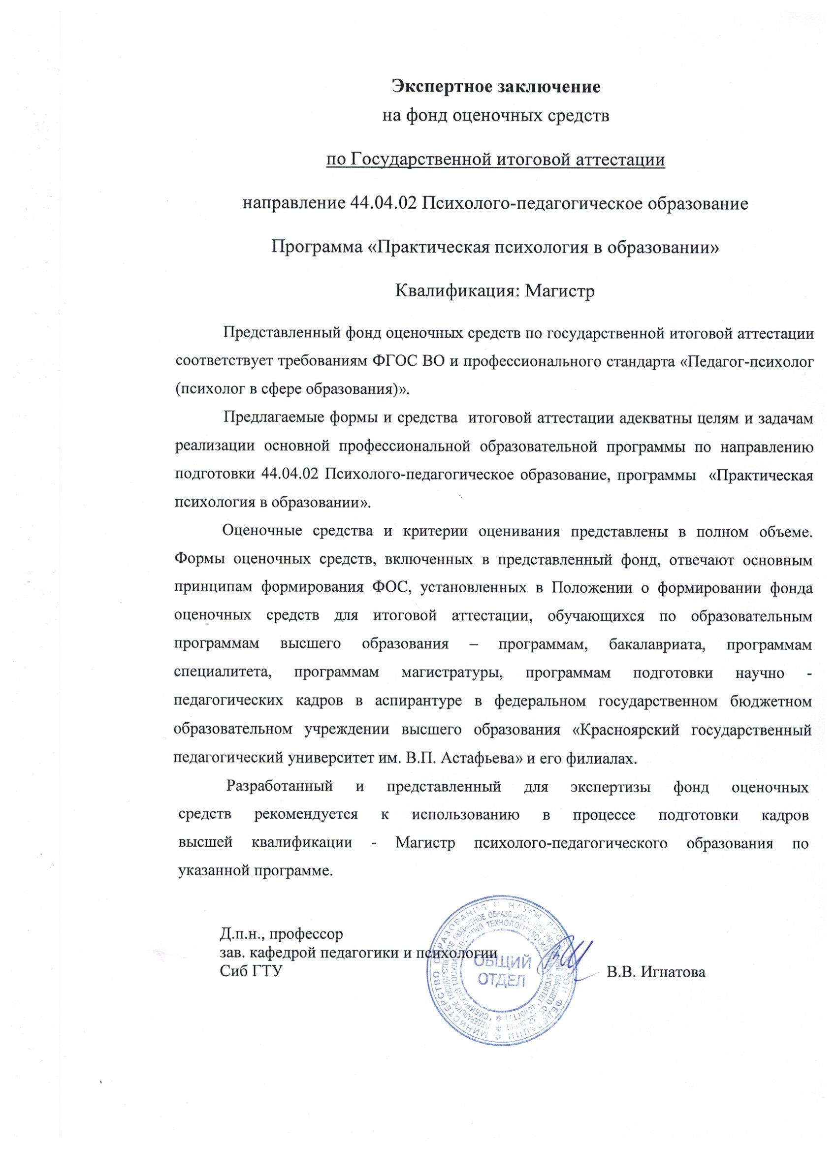 Настоящая программа составлена на основе Положения о порядке проведения государственной итоговой аттестации обучающихся по образовательным программам высшего образования – программам бакалавриата, специалитета и магистратуры в КГПУ им. В.П. Астафьева и его филиалах (2015), Положения о выпускной квалификационной работе магистра (магистерской диссертации) в федеральном государственном бюджетном образовательном учреждении высшего образования «Красноярский государственный педагогический университет им. В.П. Астафьева» (2016). Положения о формировании фонда оценочных средств для текущего контроля успеваемости, промежуточной и итоговой аттестации обучающихся по образовательным программам высшего образования в КГПУ им. В.П. Астафьева и его филиалах (2015), проекта Федерального государственного образовательного стандарта высшего образования по направлению подготовки 44.04.02 «Психолого-педагогическое образование» (2015).