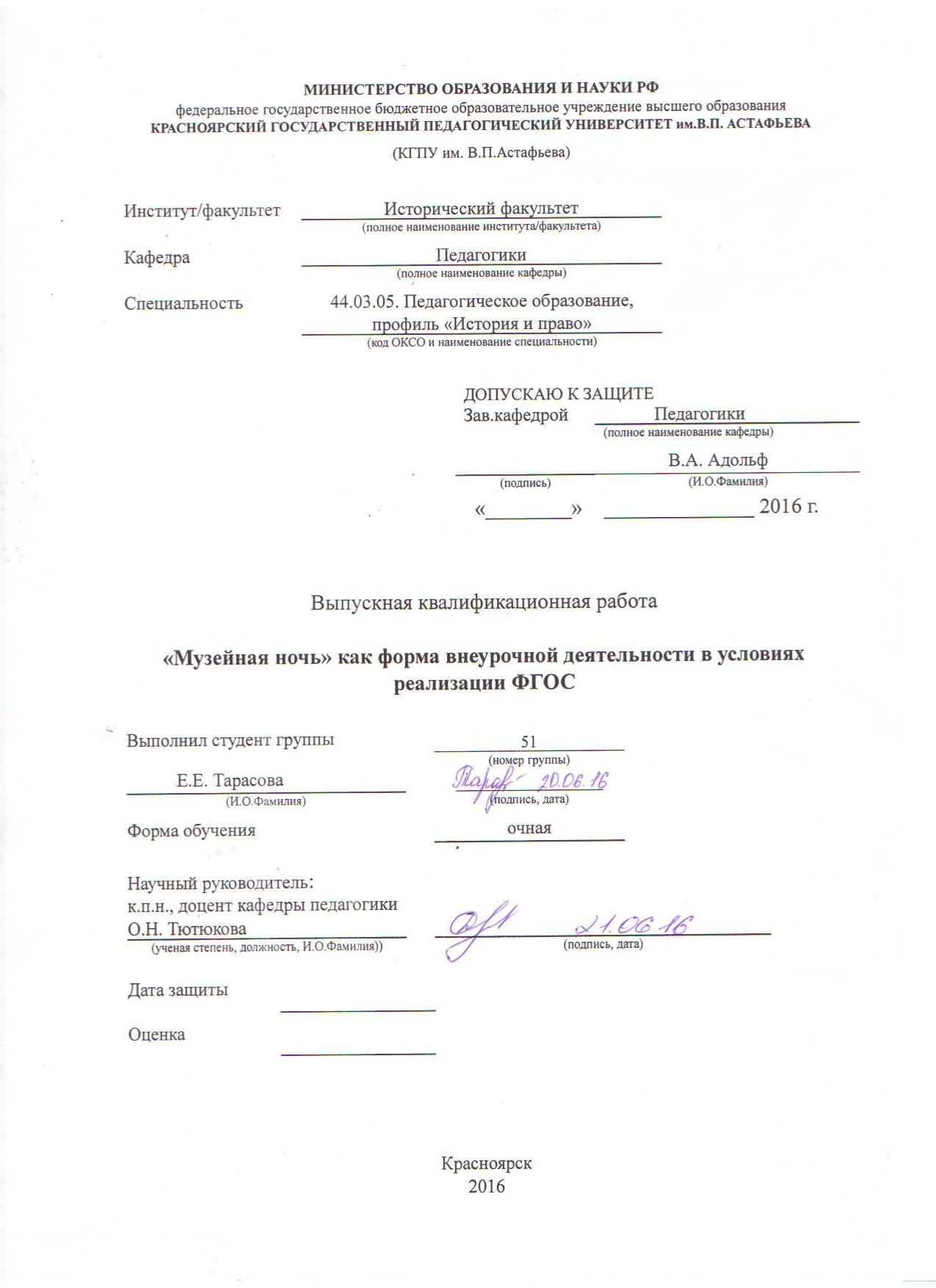 Выпускная квалификационная работа "Музейная ночь" как форма внеурочной деятельности в условиях реализации ФГОС.