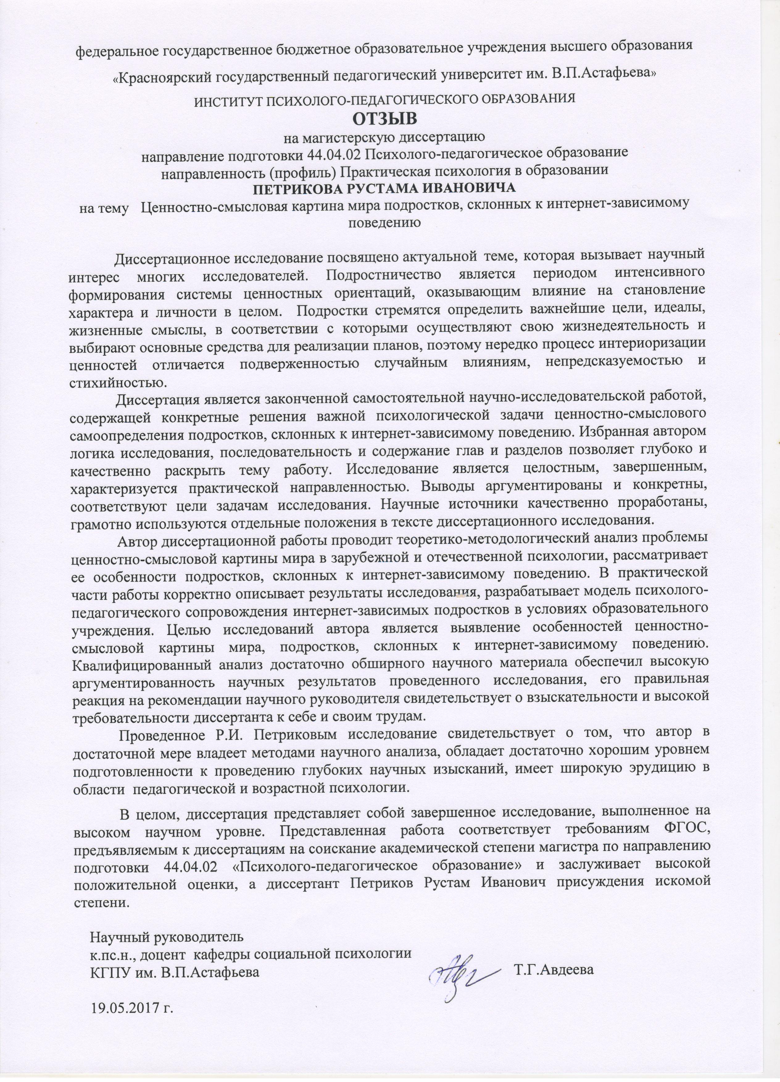Петриков Р.И. Ценностно-смысловая картина мира подростков, склонных к интернет-зависимому поведению