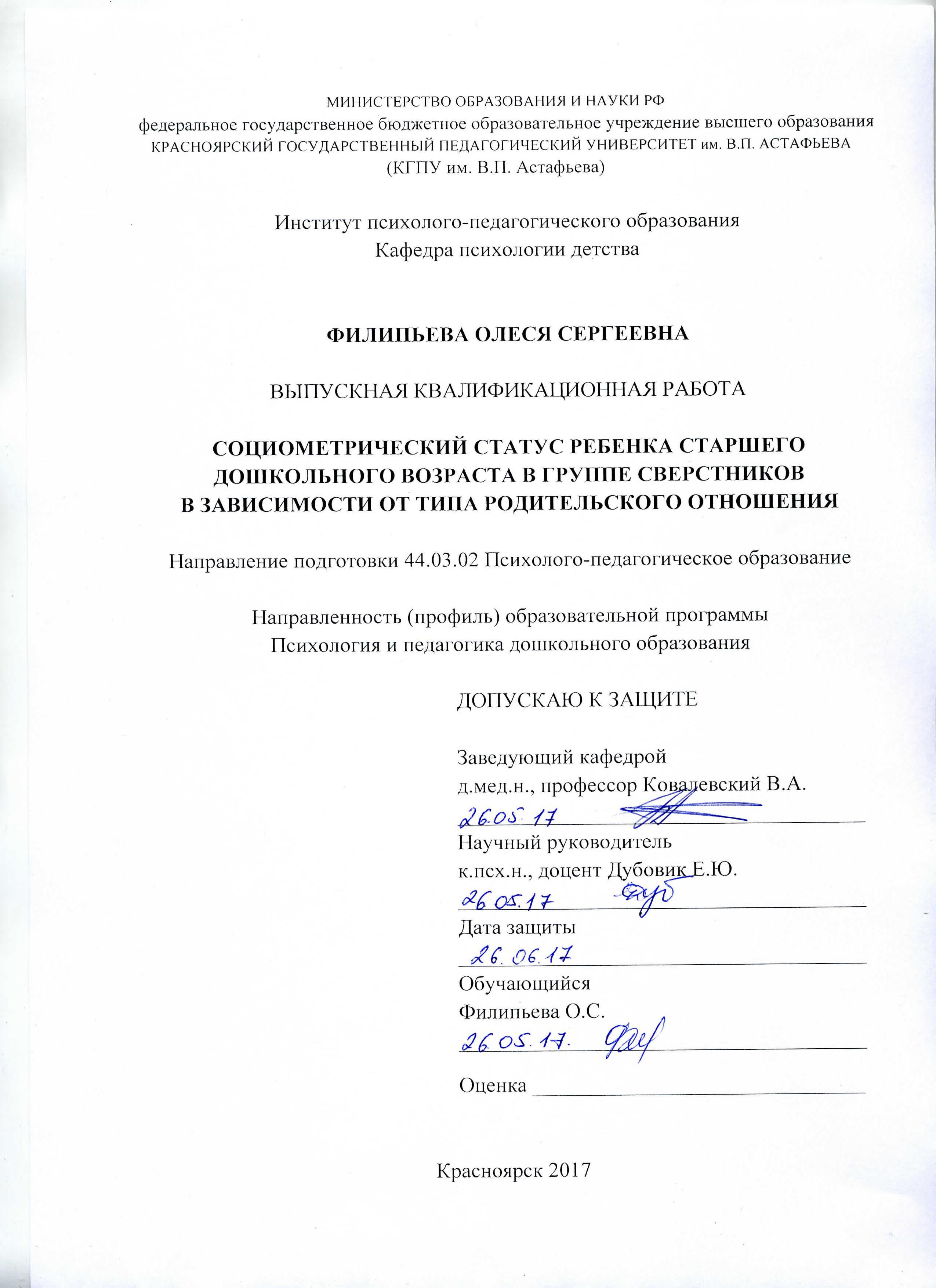 Филипьева О.С. Социометрический статус ребенка старшего дошкольного возраста в группе сверстников в зависимости от типа родительского отношения