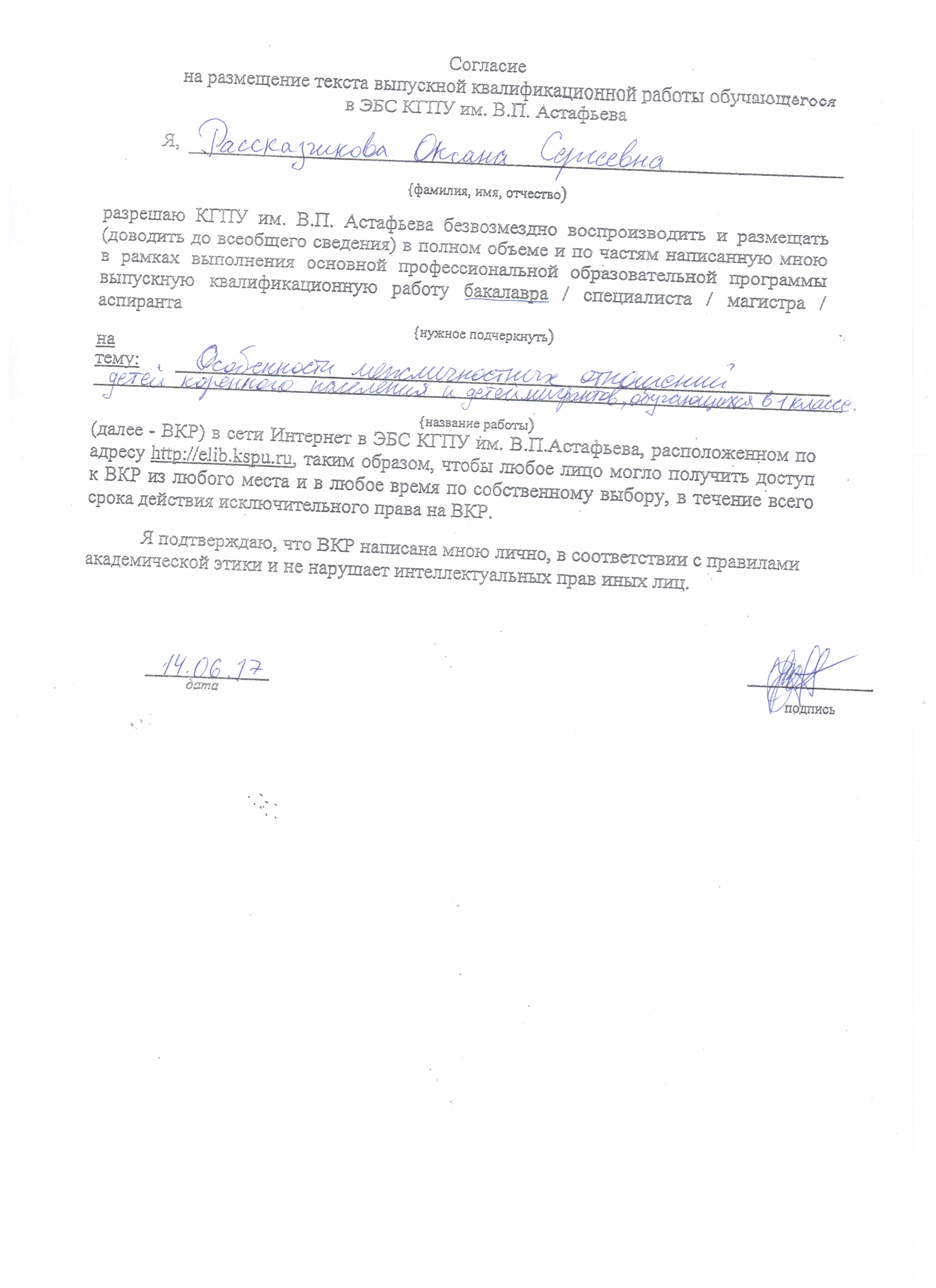 Рассказчикова О.С. Особенности межличностных отношений детей коренного населения и детей мигрантов, обучающихся в первом классе