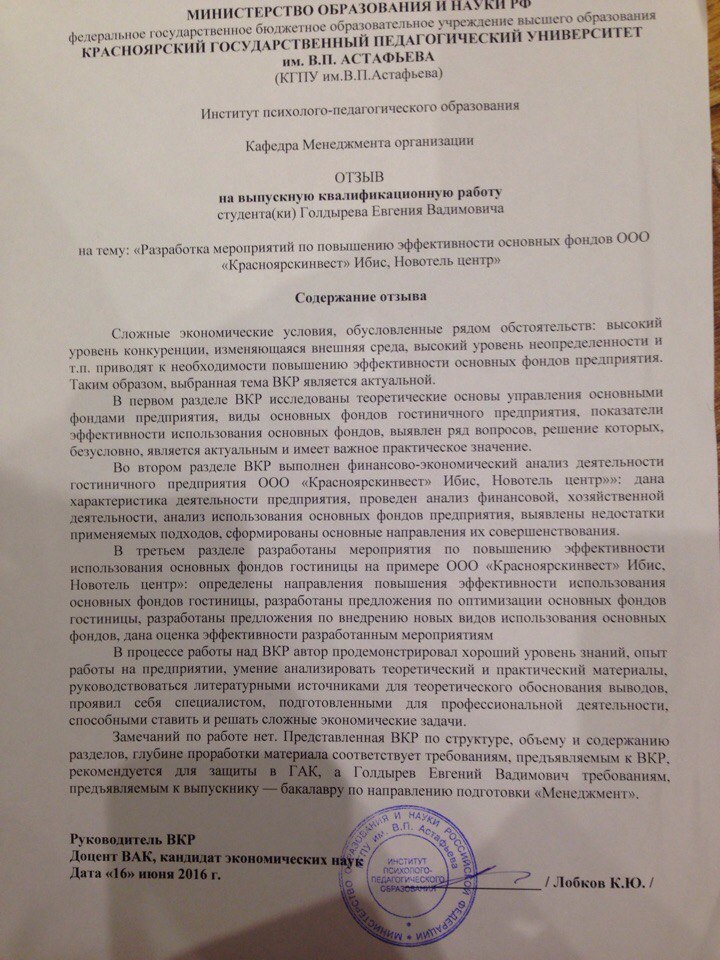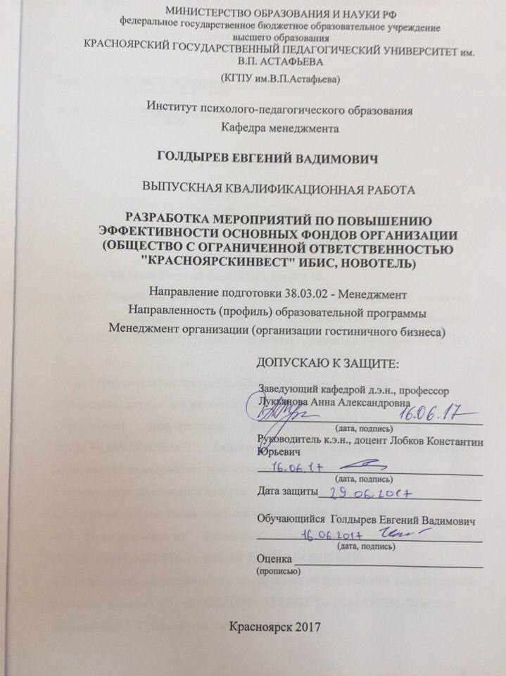 Разработка мероприятий по повышению эффективности основных фондов (общество с ограниченной ответственностью "КРАСНОЯРСКИНВЕСТ" Ибис, Новотель