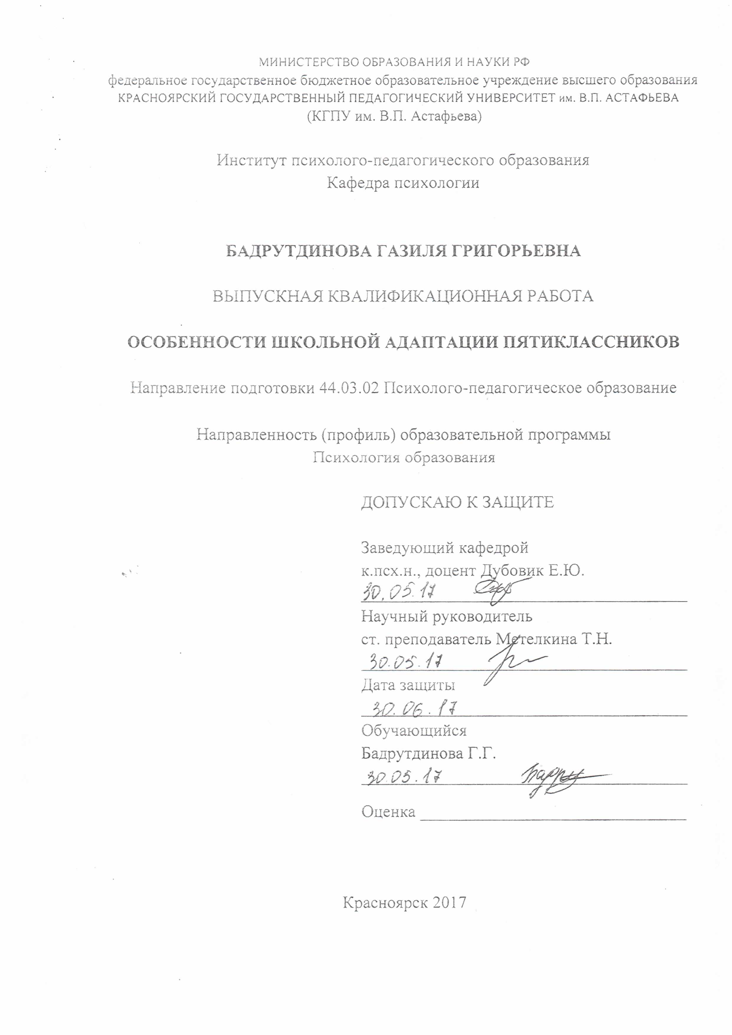 ОСОБЕННОСТИ ШКОЛЬНОЙ АДАПТАЦИИ ПЯТИКЛАССНИКОВ