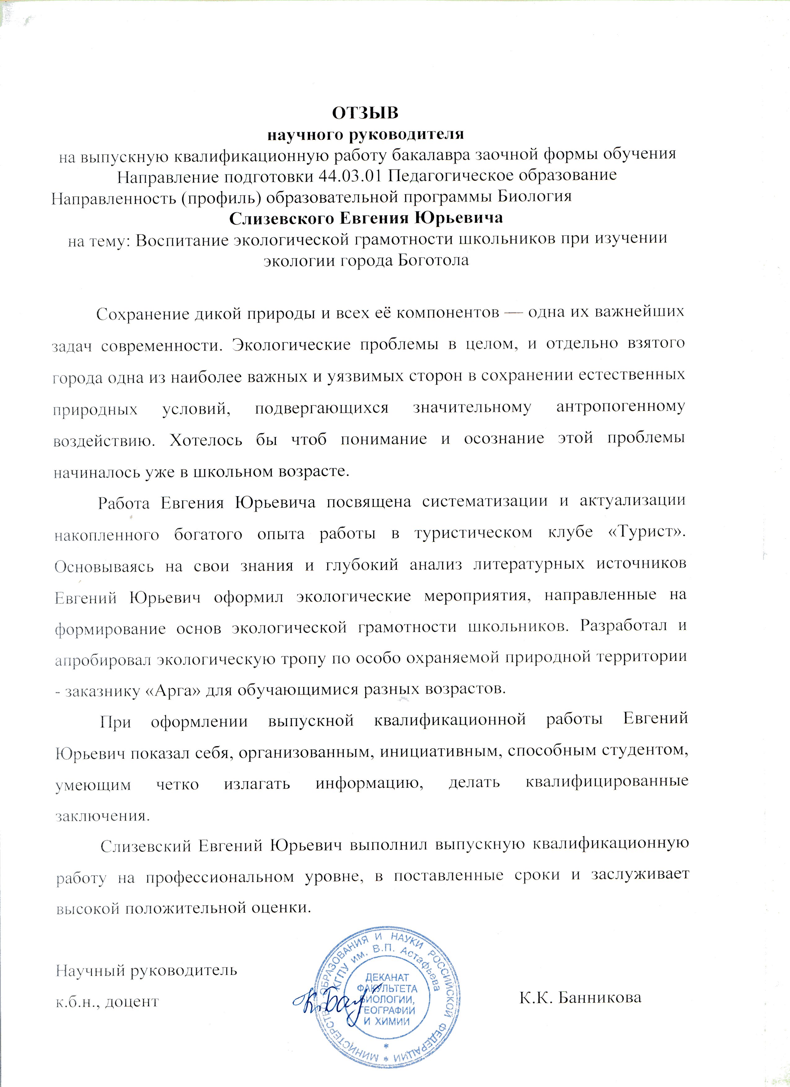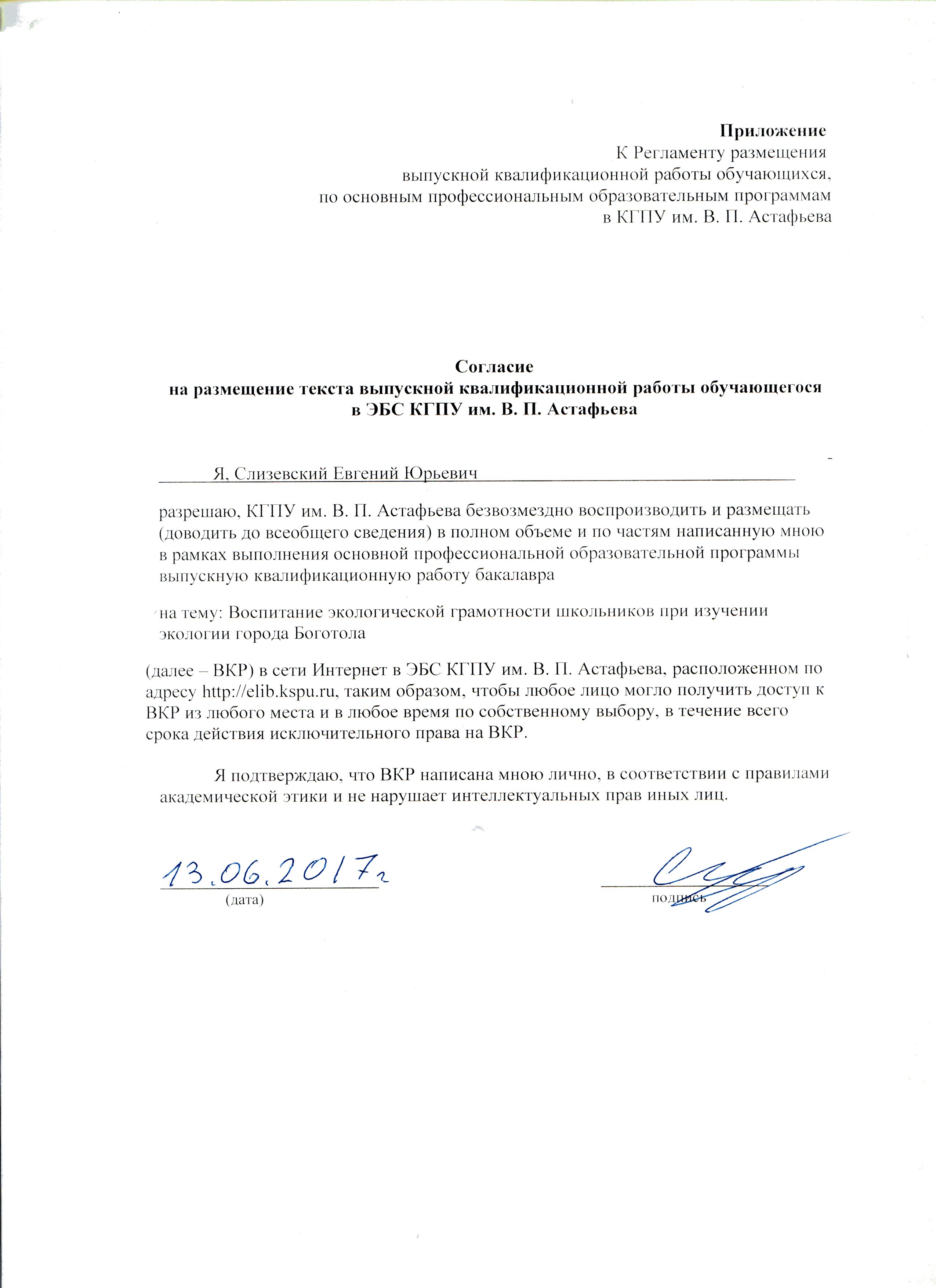 Слизевский Е.Ю. ВОСПИТАНИЕ ЭКОЛОГИЧЕСКОЙ ГРАМОТНОСТИ ШКОЛЬНИКОВ ПРИ ИЗУЧЕНИИ ОКРЕСТНОСТЕЙ ГОРОДА БОГОТОЛА