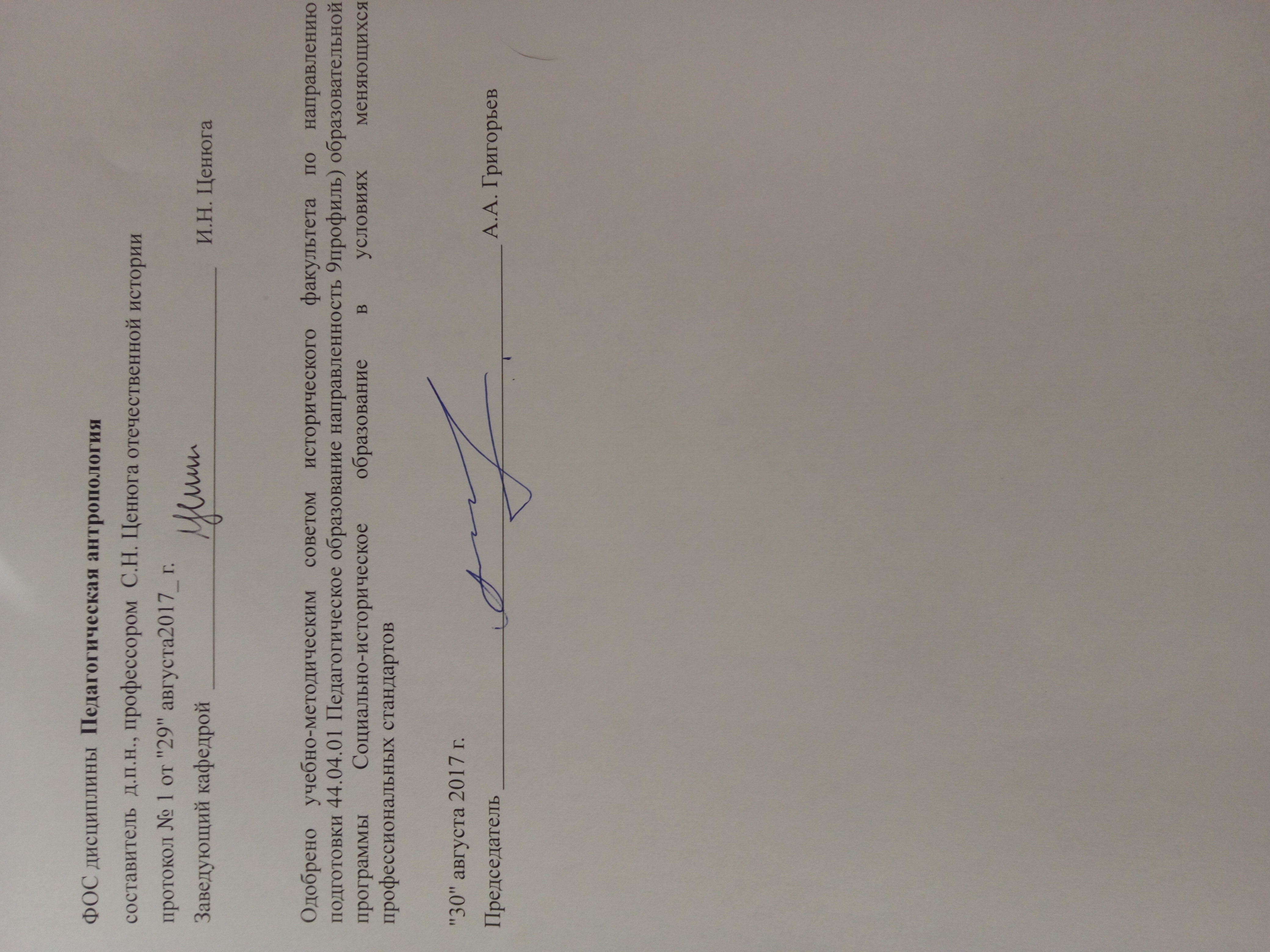 Целью создания ФОС по дисциплине по выбору «Педагогическая антропология» является установление соответствия учебных достижений запланированным результатам обучения и требованиям основной профессиональной образовательной программы, рабочей программы дисциплины.