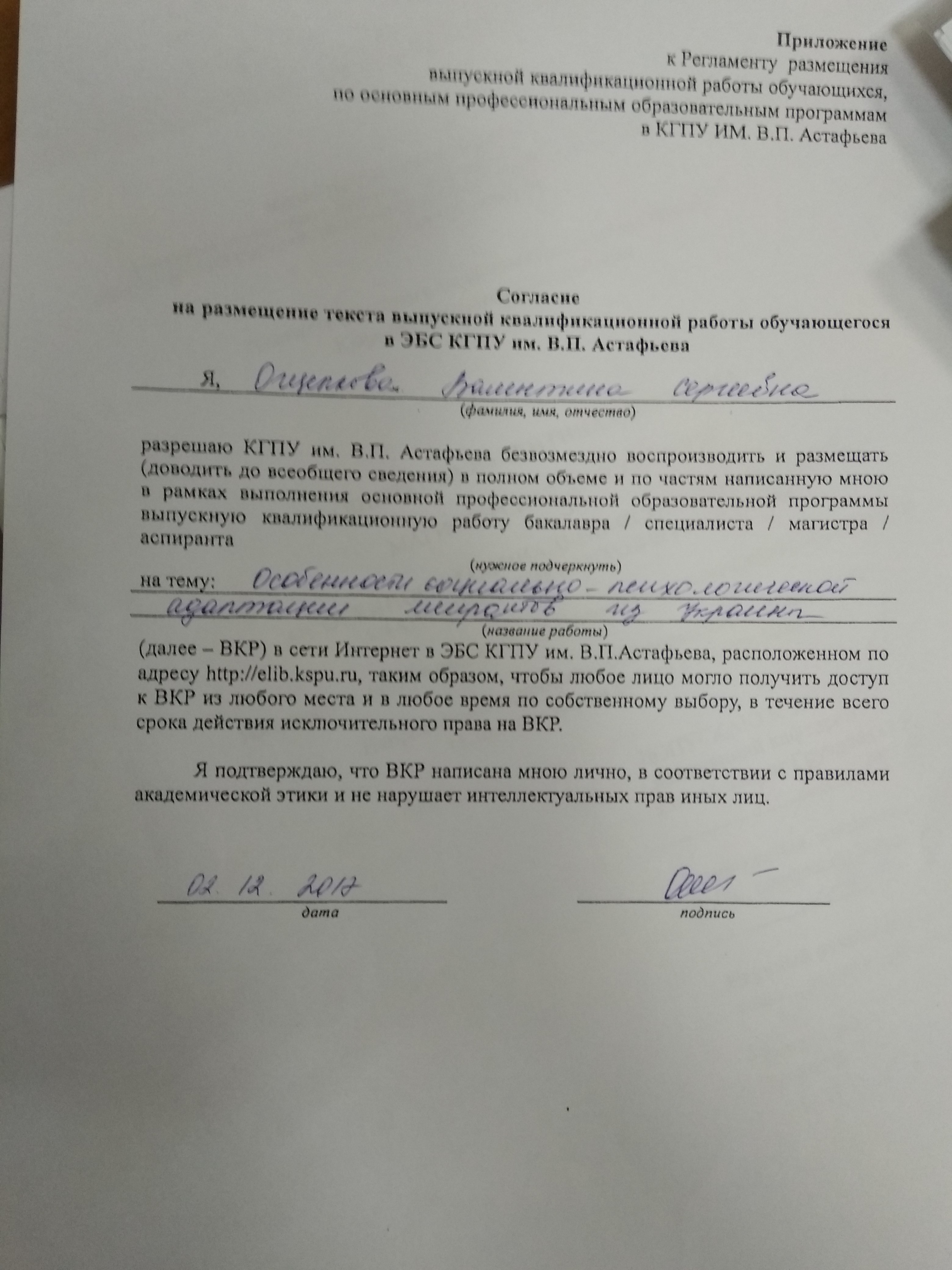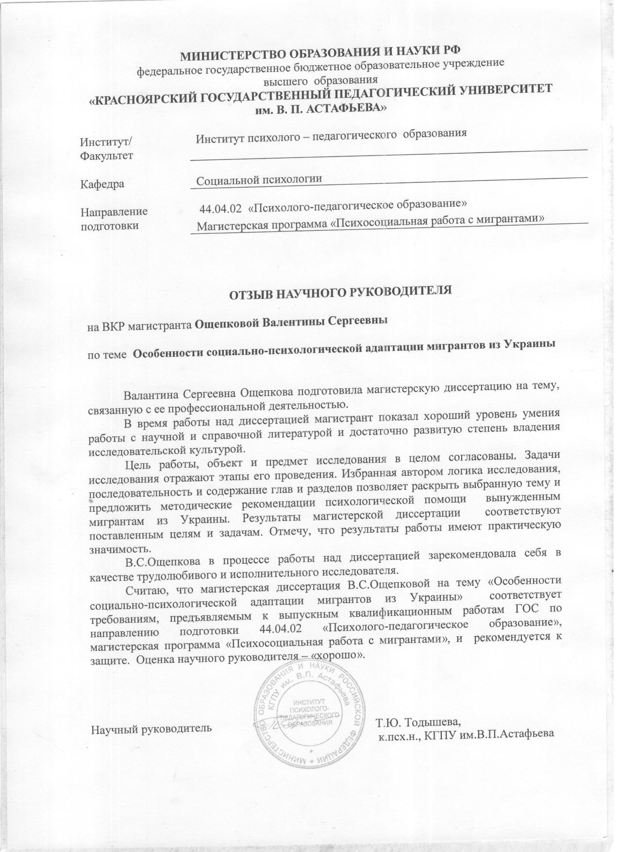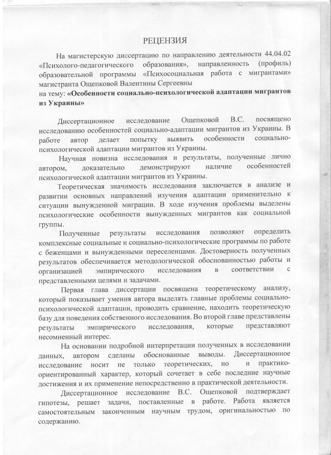 Ощепкова В.С. Особенности социально - психологической адаптации мигрантов из Украины