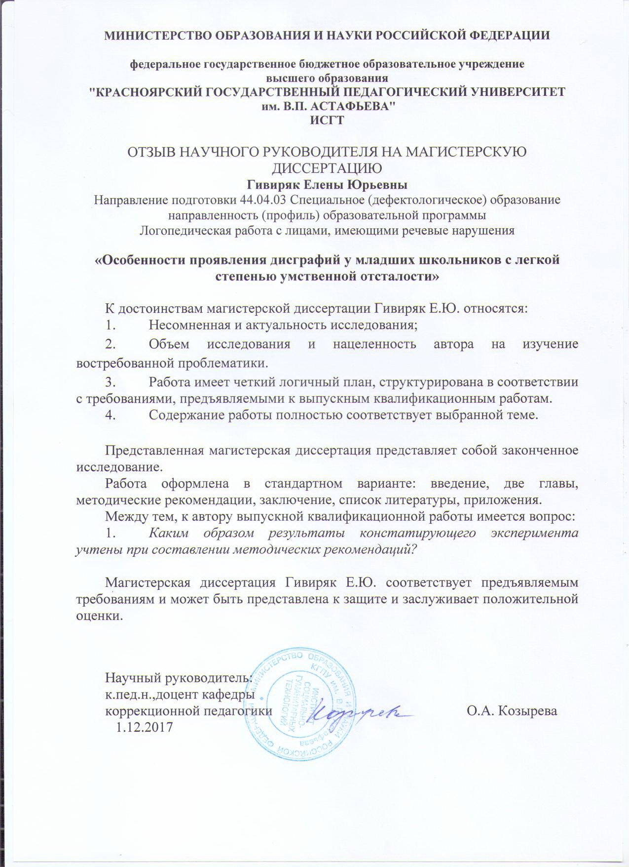 Магистерская диссертация Гивиряк ЕЮ Особенности проявления дисграфий у младших школьников с легкой степенью умственной отсталости