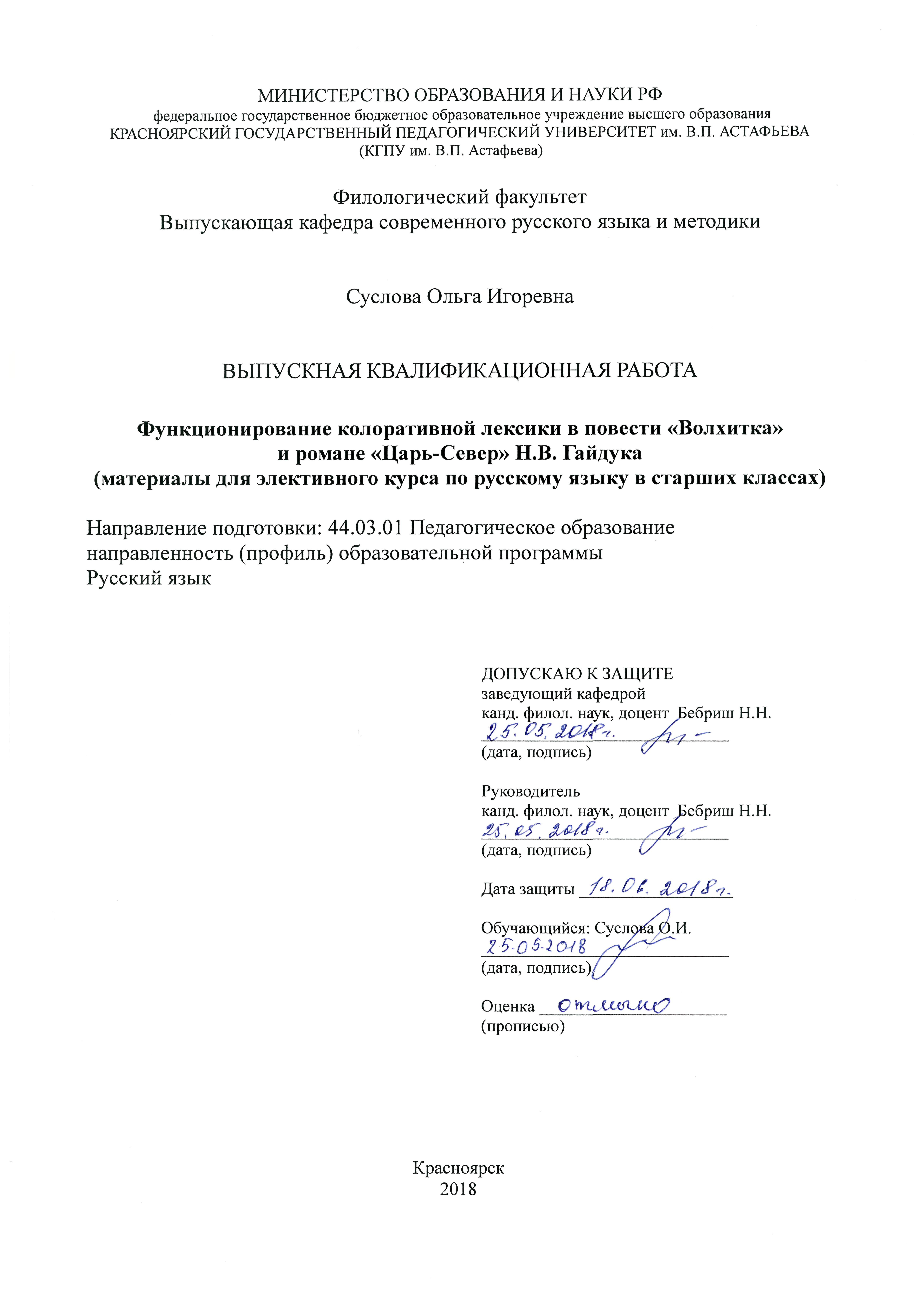 Функционирование колоративной лексики в повести "Волхитка" и романе "Царь-Север" Н.В.Гайдука (материалы для элективного курса по русскому языку в старших классах)
