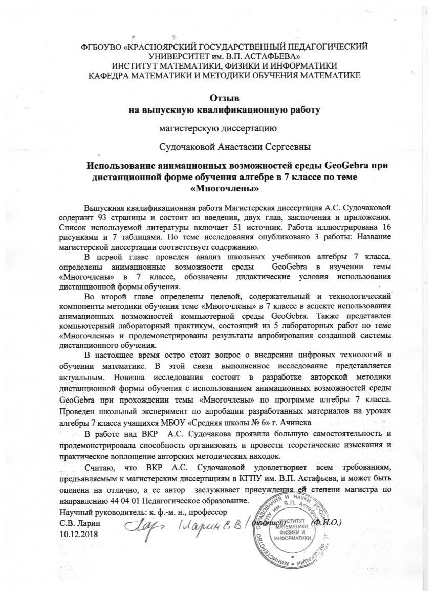 Использование анимационных возможностей среды GeoGebra при дистанционной форме обучения алгебре в 7 классе по теме "Многочлены"