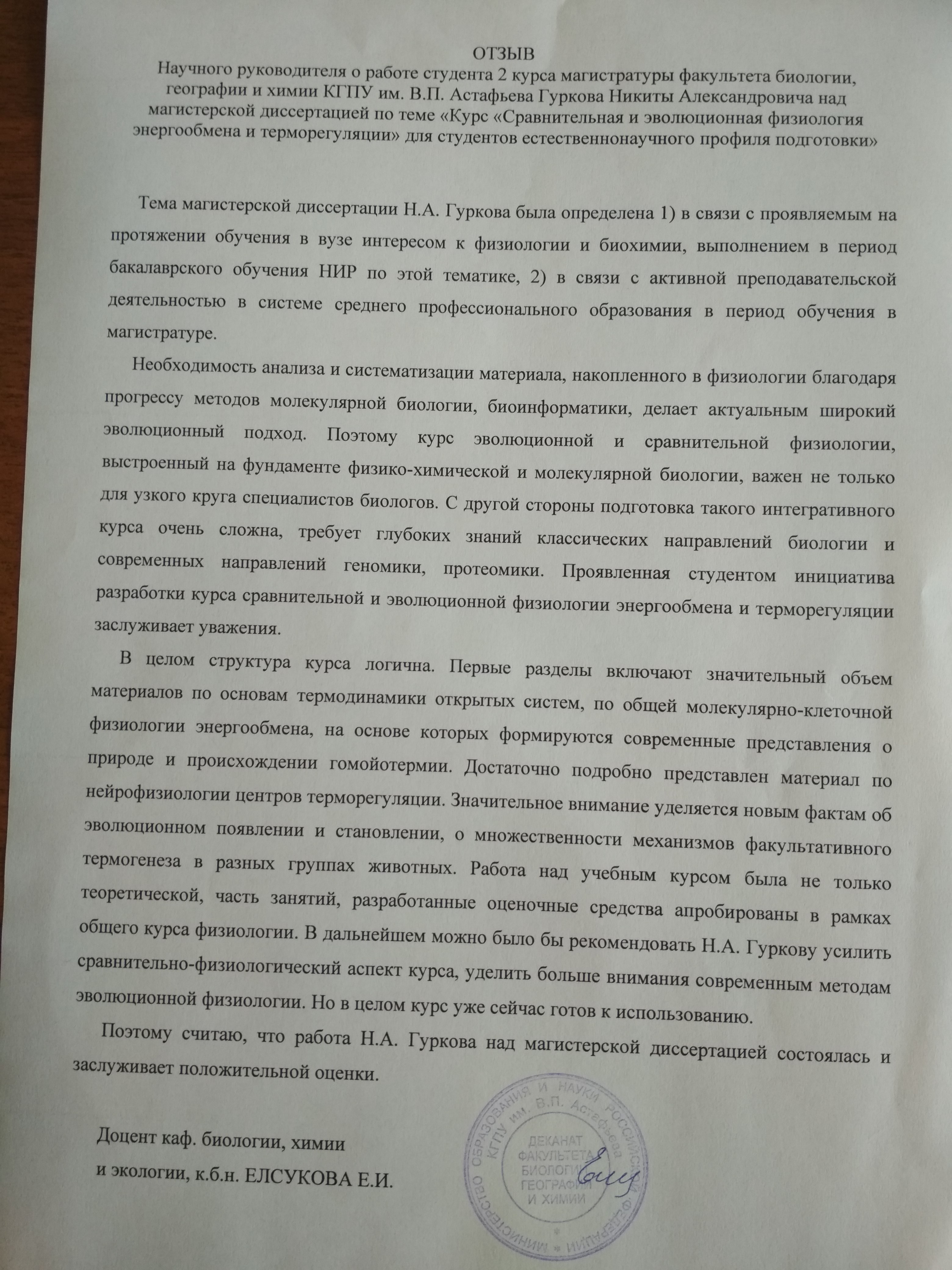 Курс "Сравнительная и эволюционная физиология энергообмена и терморегуляции" для студентов естественнонаучного профиля подготовки
