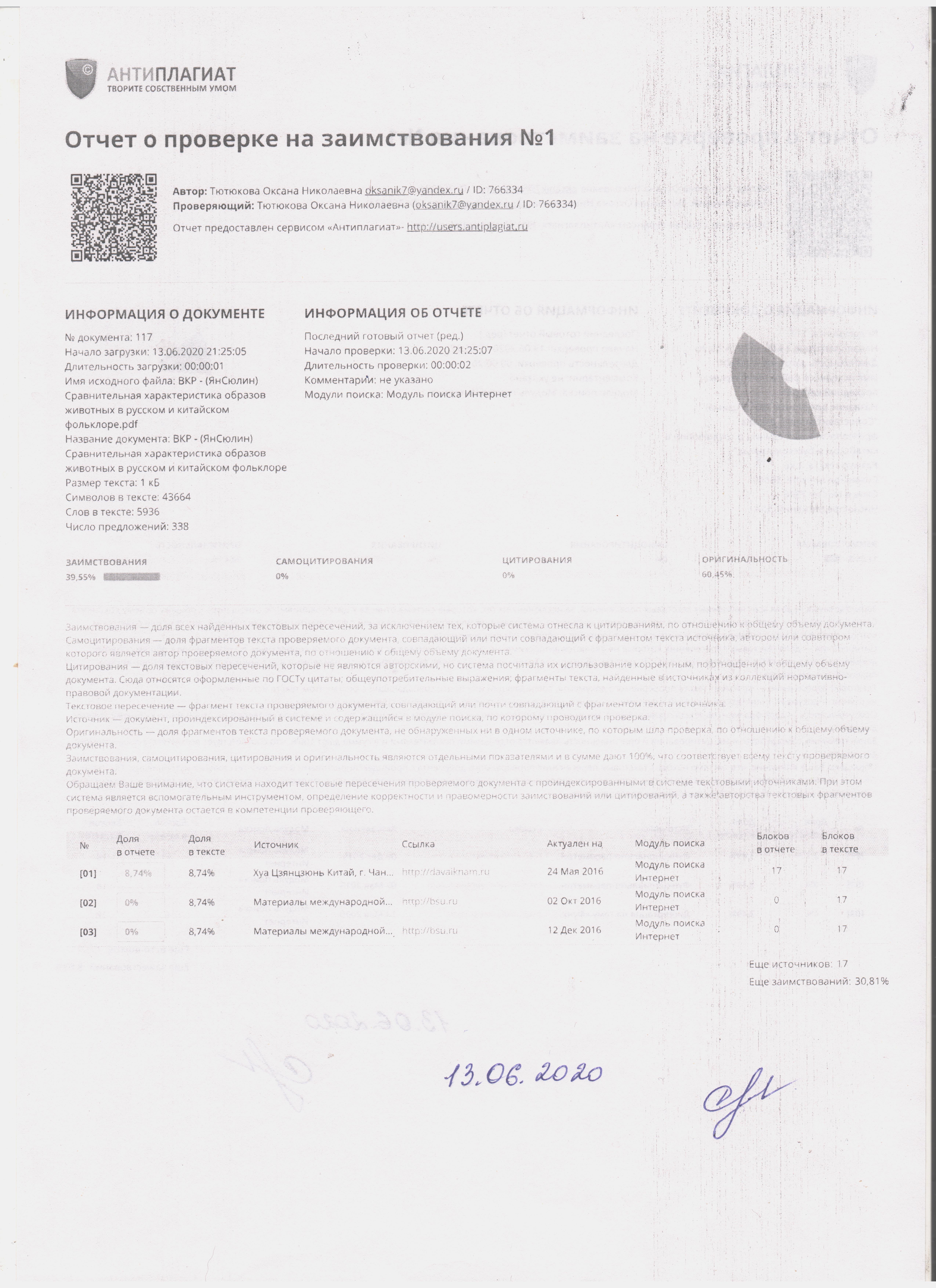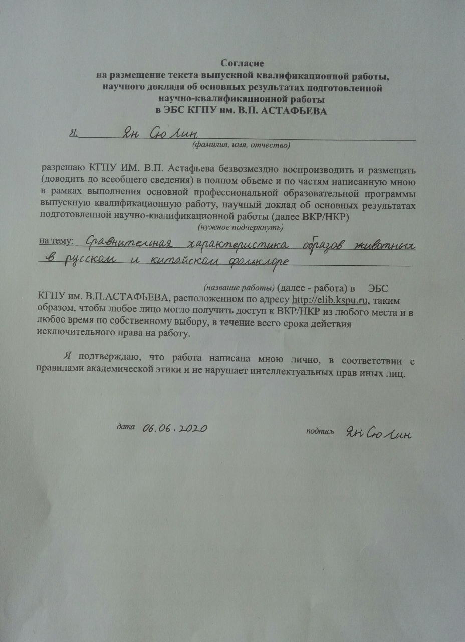 ВКР "Сравнительная характеристика образов животных в русском и китайском фольклоре".