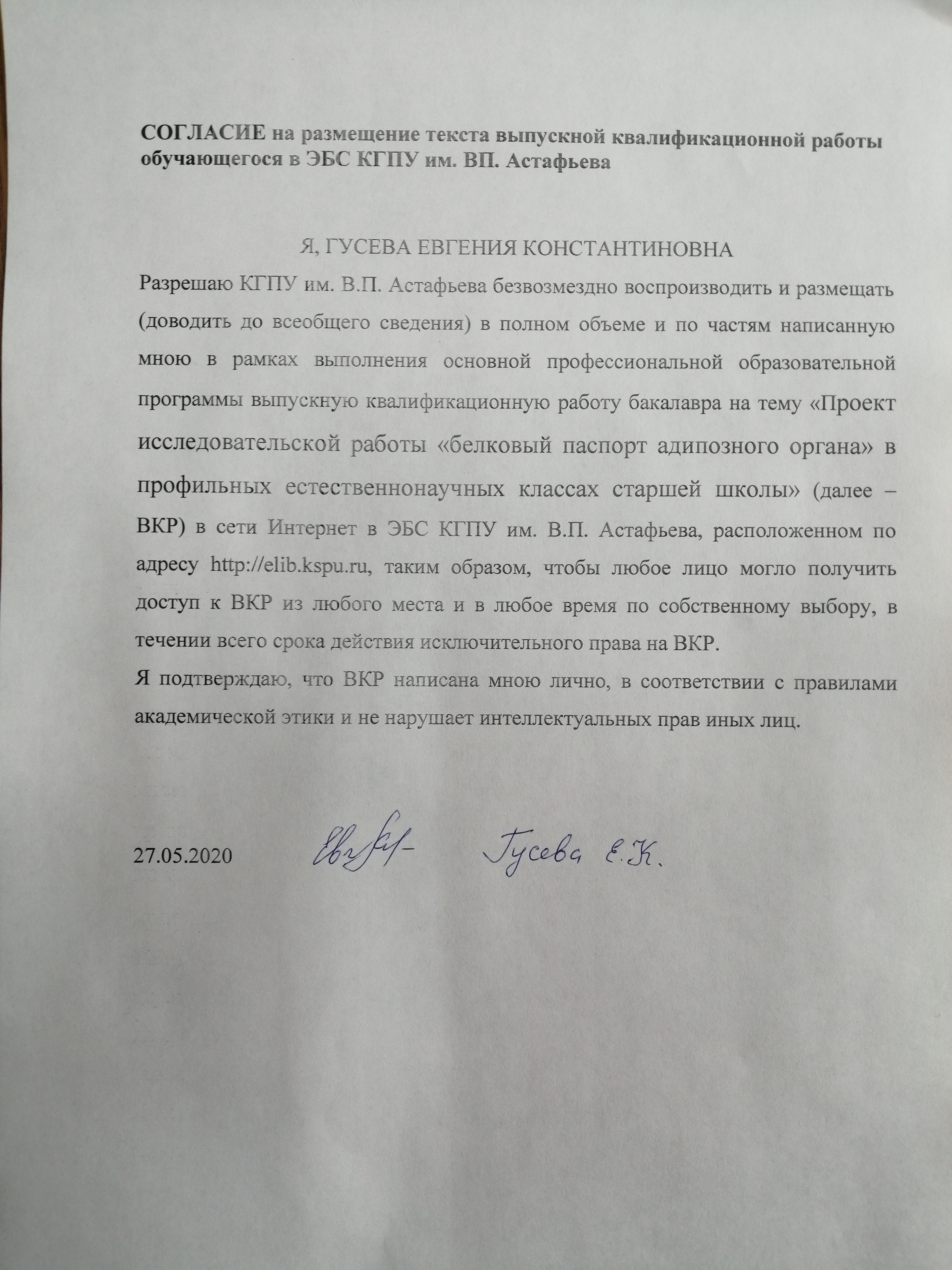 Проект исследовательской работы «Белковый паспорт адипозного органа» в профильных естественнонаучных классах старшей школы.
