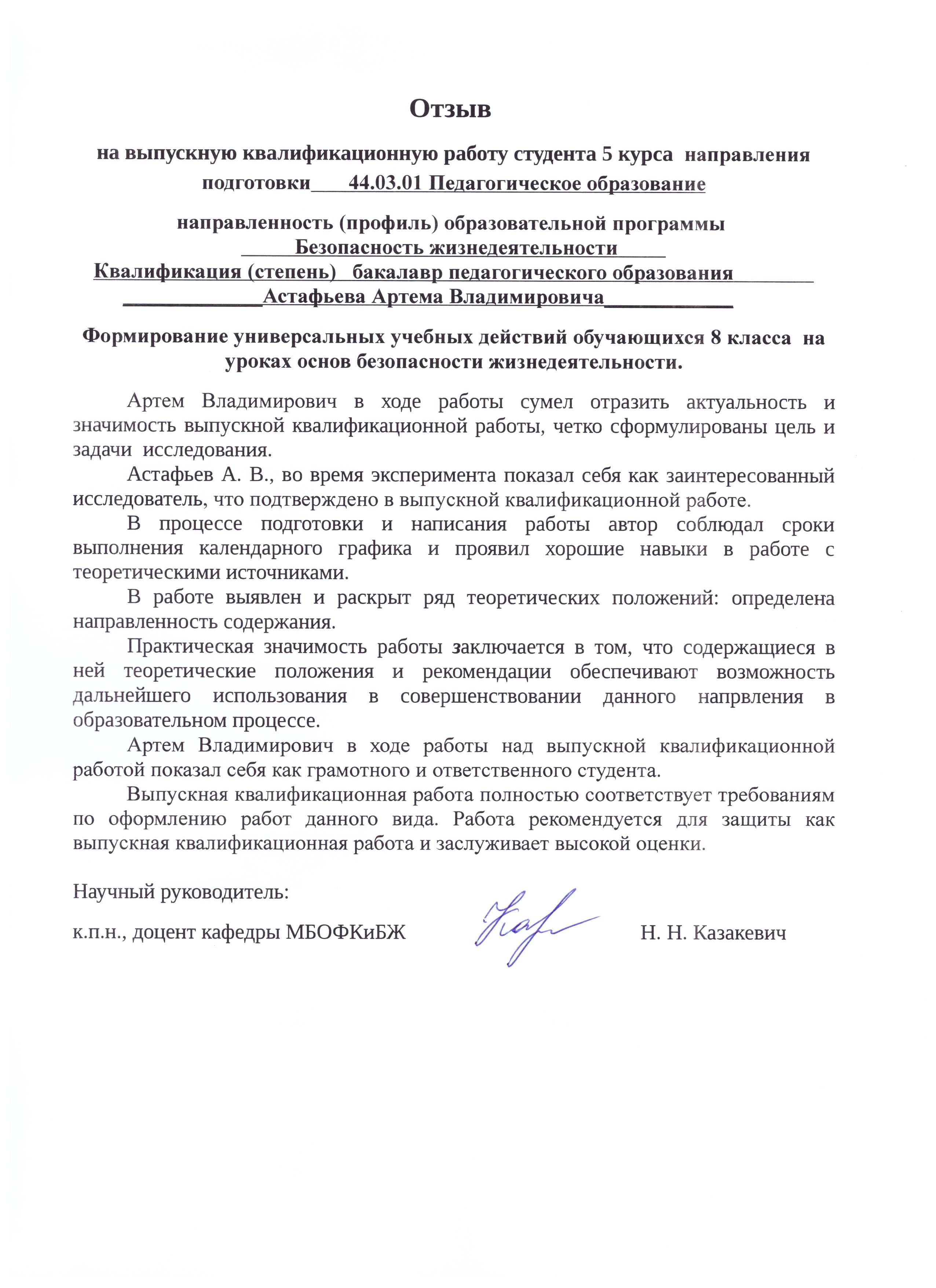 Формирование универсальных учебных действий обучающихся 8 класса на уроках основ безопасности жизнедеятельности.