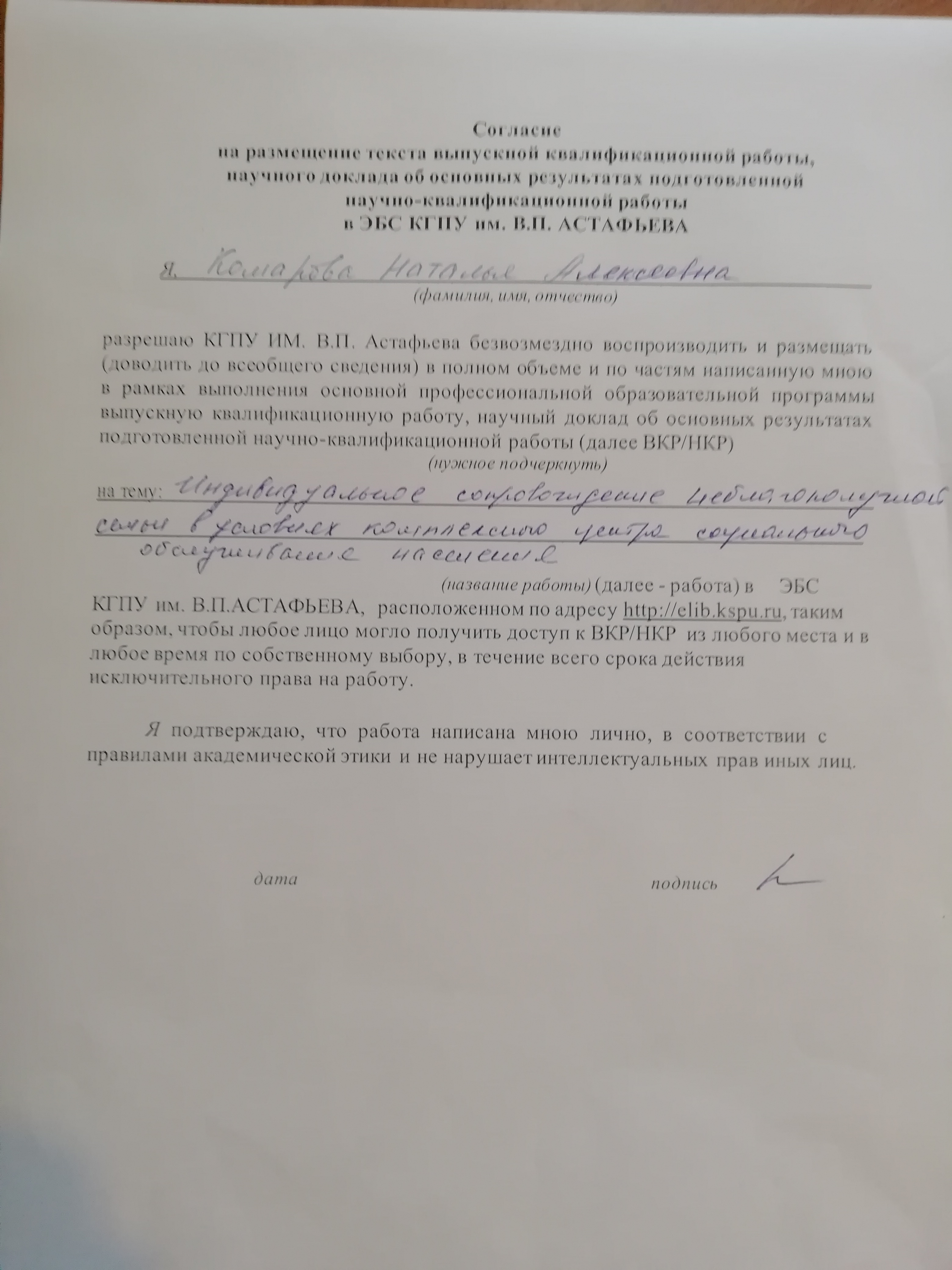 Комарова Наталья Алексеевна Индивидуальное сопровождение неблагополучной семьи в условиях комплексного центра социального обслуживания населения