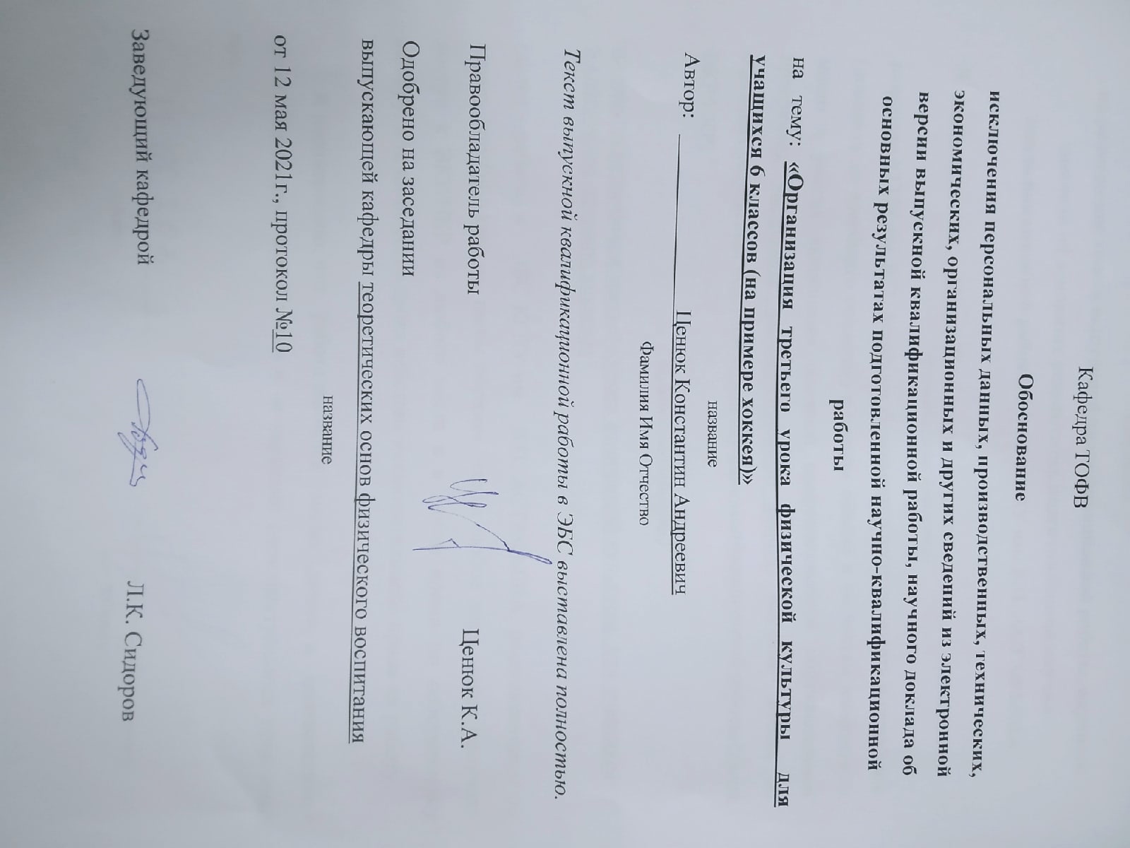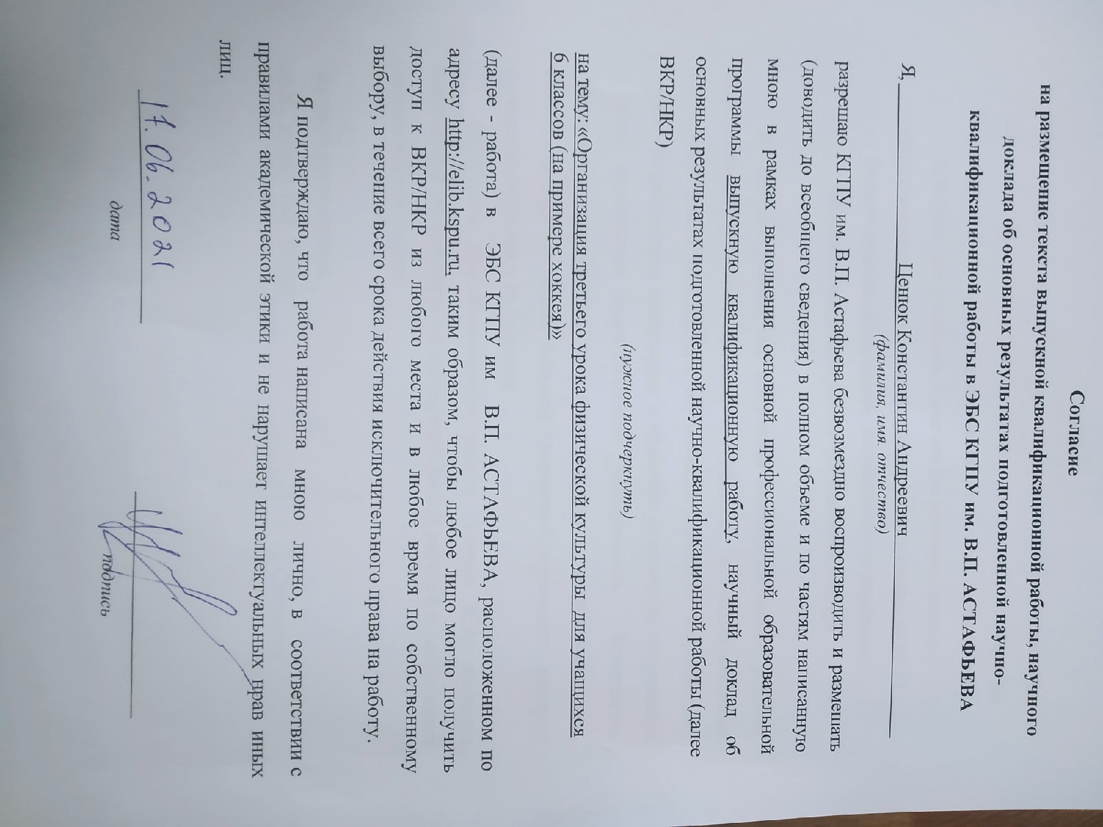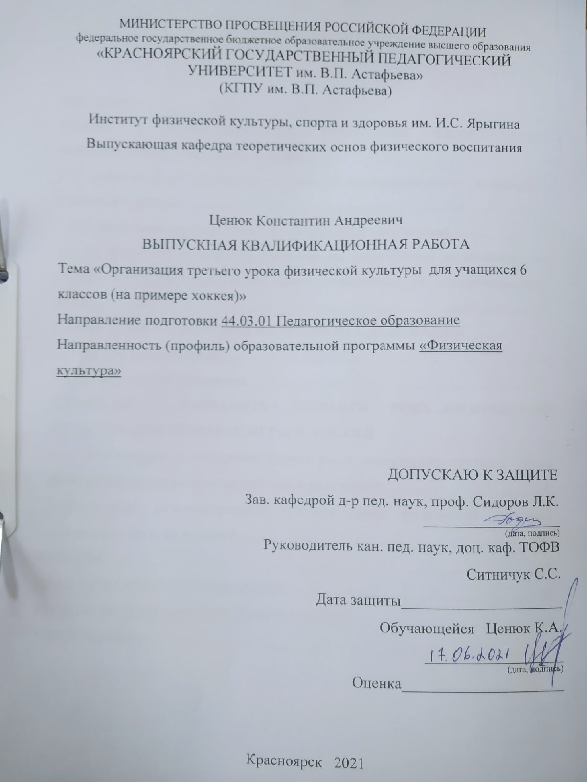 Организация третьего урока физической культуры для учащихся 6 классов (на примере хоккея)