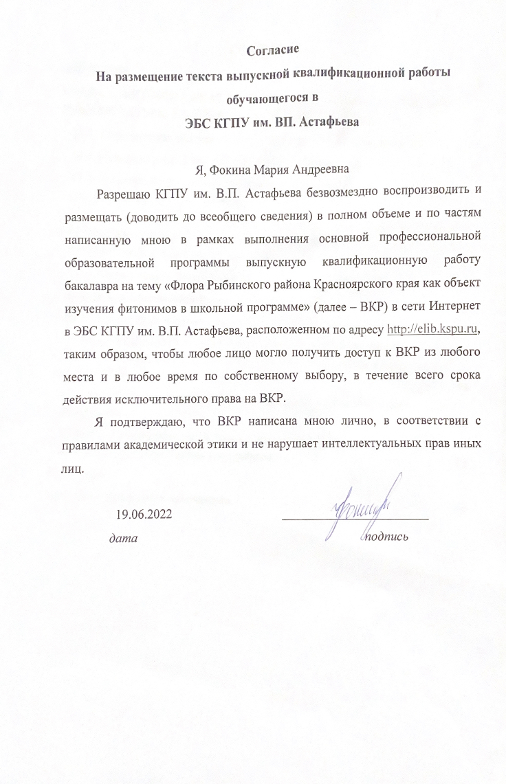 ФЛОРА РЫБИНСКОГО РАЙОНА КРАСНОЯРСКОГО КРАЯ КАК ОБЪЕКТ ИЗУЧЕНИЯ ФИТОНИМОВ В ШКОЛЬНОЙ ПРОГРАММЕ